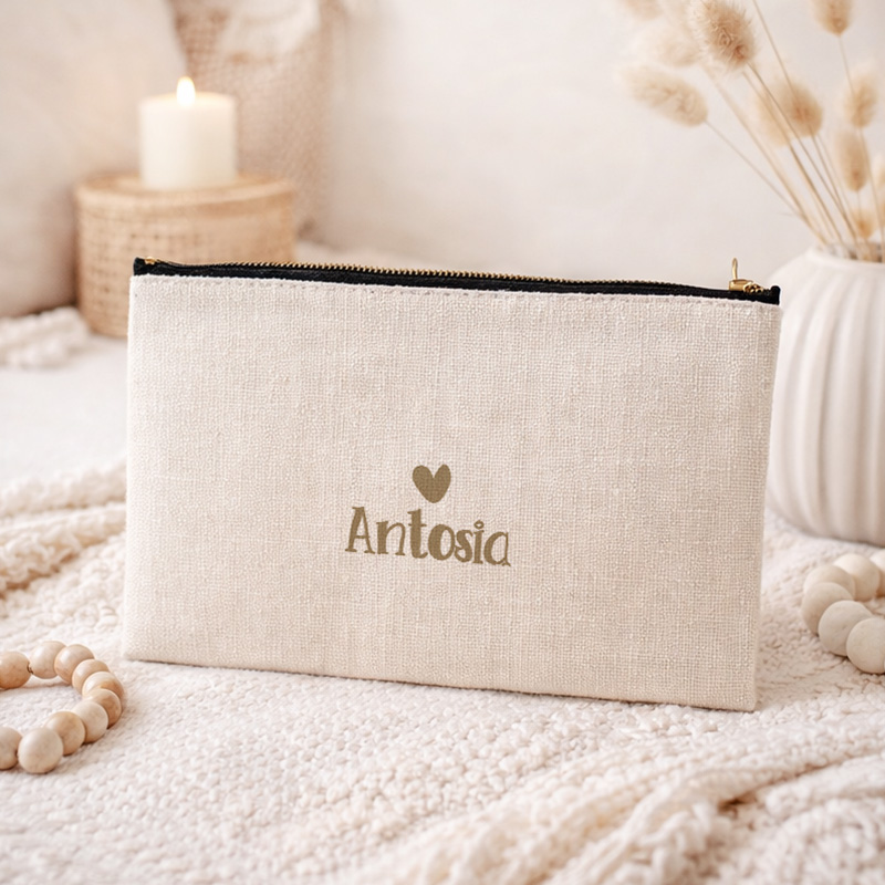 Kosmetyczka z imieniem to subtelny, a zarazem wyjątkowy prezent dla kobiety. Kosmetyczka została wykonana z materiału o lnianej strukturze w jasnym, beżowym odcieniu. Stonowana kolorystyka nadaje jej elegancji i uniwersalnego charakteru. Kosmetyczka zamykana jest na zamek błyskawiczny. Centralnym elementem projektu jest personalizacja imieniem, uzupełniona delikatnym serduszkiem. Kosmetyczka jest pojemna i praktyczna. Bez problemu pomieści kosmetyki do makijażu, drobiazgi higieniczne, biżuterię czy inne drobne akcesoria. Może pełnić funkcję organizera w torebce, kosmetyczki podróżnej, etui na dokumenty lub schowka na kobiece drobiazgi. Dzięki kompaktowym wymiarom jest wygodna w codziennym użytkowaniu i łatwa do zabrania w podróż.