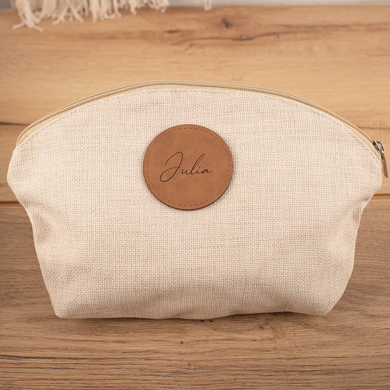 Kosmetyczka bez problemu pomieści najpotrzebniejsze produkty – od kosmetyków do makijażu, po artykuły higieniczne czy drobiazgi na wyjazd. Jej wnętrze zapinane jest na suwak, co zapewnia bezpieczeństwo przechowywania. Kosmetyczka ozdobiona jest okrągła naszywka ze skóry ekologicznej z wygrawerowanym imieniem.