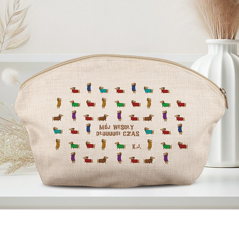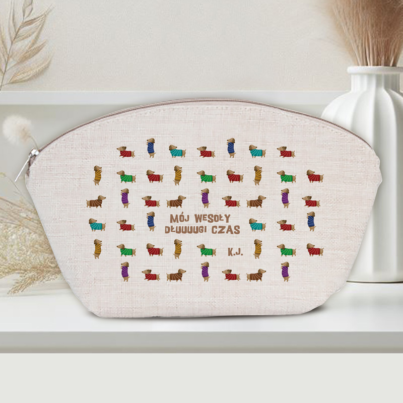 Praktyczna kosmetyczka o zabawnym i oryginalnym wyglądzie, który ucieszy każdą miłośniczkę psów. Wzór przedstawiający kolorowe jamniki w sweterkach na jasnym tle nadaje całości radosnego charakteru i przyciąga wzrok. Na środku umieszczony został napis „Mój wesoły dluuugi czas”, który w połączeniu z uroczymi ilustracjami wywołuje uśmiech. Dodatkowym atutem jest personalizacja w postaci inicjałów właścicielki, dzięki czemu staje się dopasowa do właścicielki.