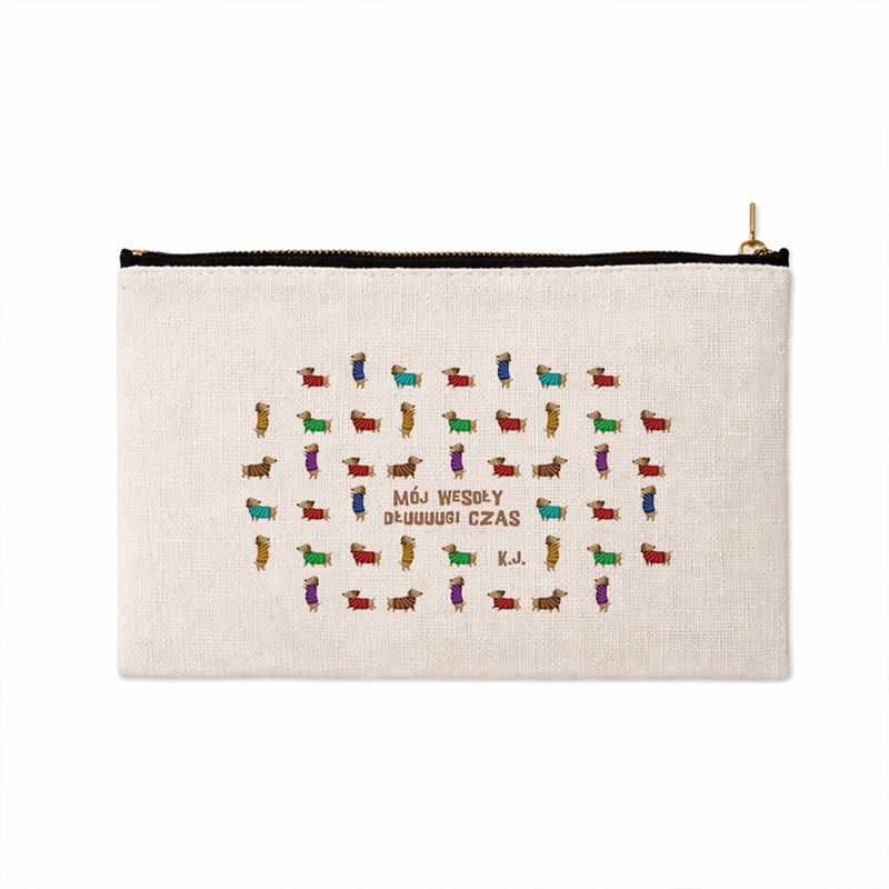 Praktyczna kosmetyczka o zabawnym i oryginalnym wyglądzie, który ucieszy każdą miłośniczkę psów. Wzór przedstawiający kolorowe jamniki w sweterkach na jasnym tle nadaje całości radosnego charakteru i przyciąga wzrok. Na środku umieszczony został napis „Mój wesoły dluuugi czas”, który w połączeniu z uroczymi ilustracjami wywołuje uśmiech. Dodatkowym atutem jest personalizacja w postaci inicjałów właścicielki, dzięki czemu staje się dopasowana do właścicielki.