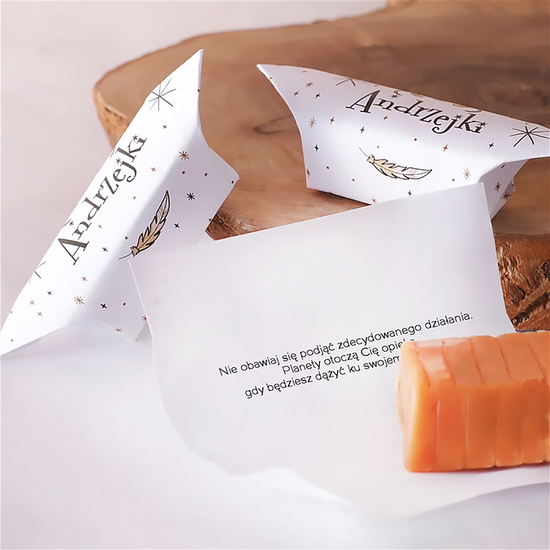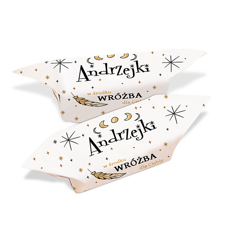 - Smaczna krówka posiada ozdobny papierek, który wewnątrz ma ukrytą wróżbę! Jest to idealny sposób, aby odpowiednio podkreślić ważność Andrzejek, w szczególności, gdy jest zaplanowana impreza z tej okazji.