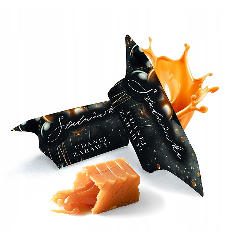 Każda krówka zapakowana jest w stylowy papierek z napisem „Studniówka – Udanej zabawy!”. To prosty, ale bardzo efektowny sposób na wprowadzenie spójnego motywu dekoracyjnego. Motyw balonów i elegancka czcionka przyciągają wzrok. W jednym opakowaniu znajduje się aż 1 kg krówek, dlatego wystarczy ich dla całej klasy, nauczycieli i zaproszonych gości. Krówki są miękkie, lekko ciągnące i mają klasyczny mleczny smak, który zna każdy z dzieciństwa. To połączenie tradycji i elegancji w jednym małym smakołyku. Można je rozłożyć przy nakryciach, umieścić w ozdobnych misach albo zapakować do woreczków z bilecikami. Dzięki temu stają się częścią aranżacji sali i jednocześnie miłym upominkiem. Co ważne, ich uniwersalny wygląd pasuje zarówno do kobiecych, jak i męskich stylizacji przyjęcia.