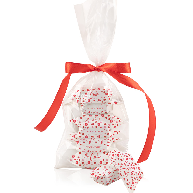 Zestaw obejmuje 10 sztuk krówek, a w środku każdej znajduje się tekst w papierku – zadanie dla pary. Krówki zapakowane są w celofanowy woreczek i przewiązane czerwoną wstążką, dzięki czemu prezentują się spójnie z walentynkową tematyką.