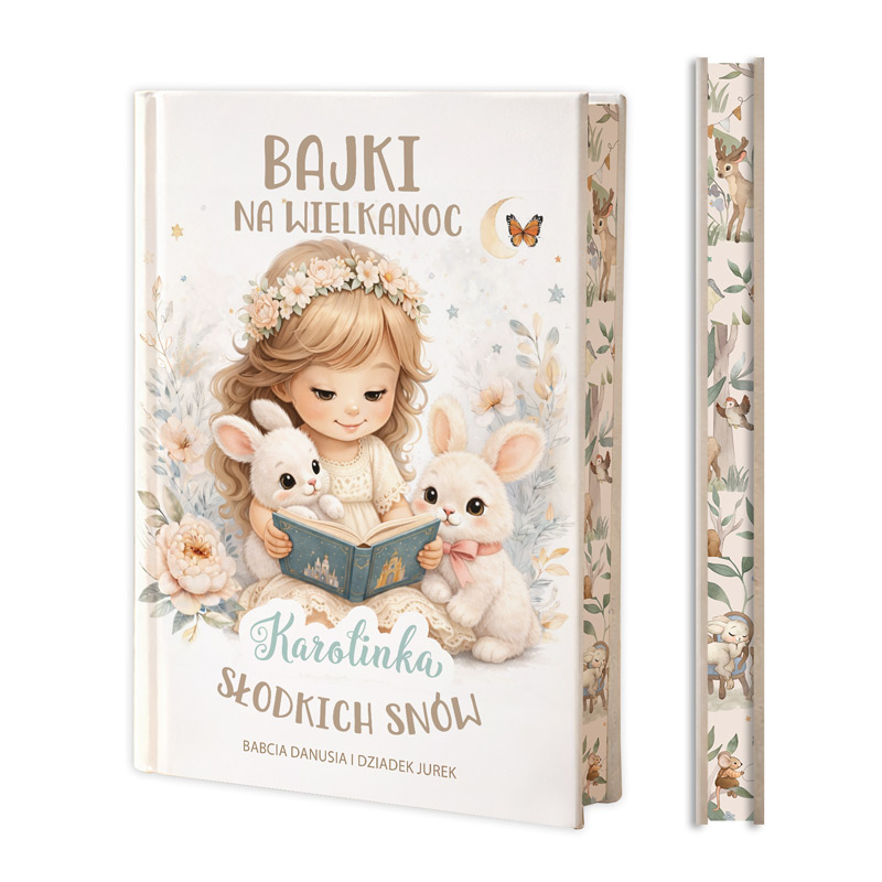 W środku znajdują się piękne opowieści polskich autorów, które rozwijają wyobraźnię, uczą wrażliwości i wprowadzają w magiczny świat bajek. Książkę dopełniają zdobione brzegi. Książka doskonale sprawdzi się jako prezent od Zajączka Wielkanocnego. Można podarować ją jako główny upominek lub jako element większego zestawu wielkanocnego – na przykład ze słodyczami. Personalizowana książka z kolorowymi brzegami to wyjątkowy prezent wielkanocny dla dziewczynki, który łączy piękne wydanie, wartościową treść i osobisty charakter.