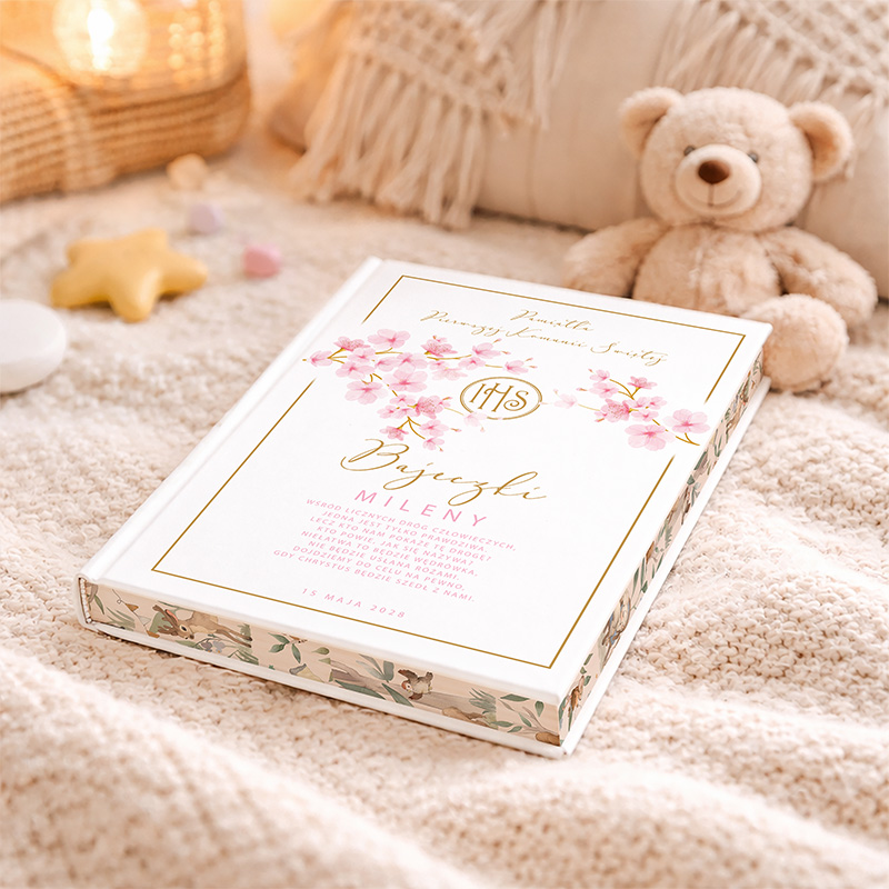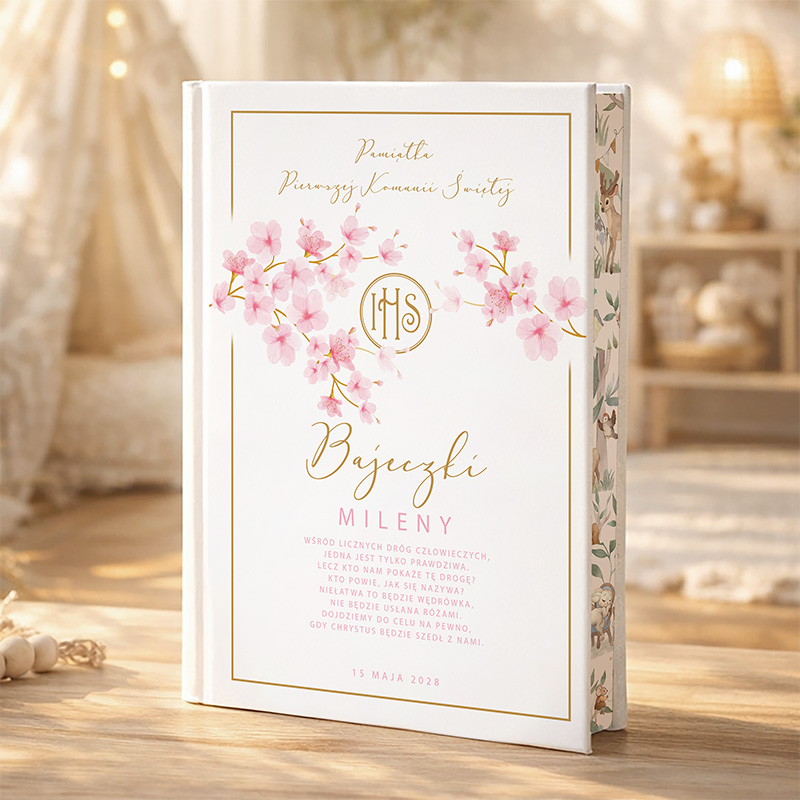Twarda okładka książki została ozdobiona motywem różowych kwiatów, które nadają całości delikatności i uroku. Centralnie umieszczony symbol IHS w złotym kolorze podkreśla religijny charakter Pierwszej Komunii Świętej. Dodatkowo dodanie imienia dziecka sprawia, że książka staje się wyjątkowym i osobistym prezentem na Komunię.