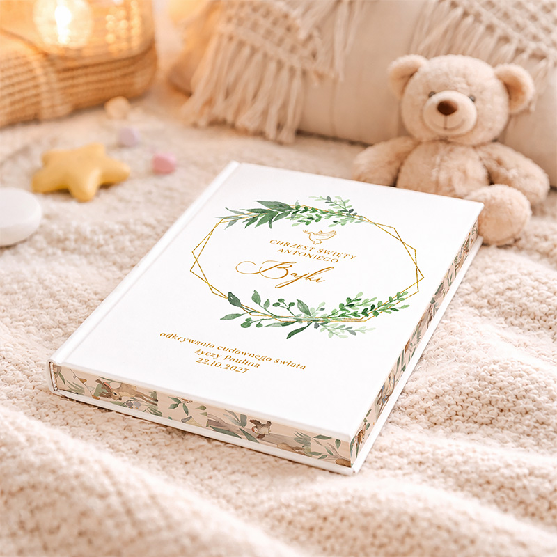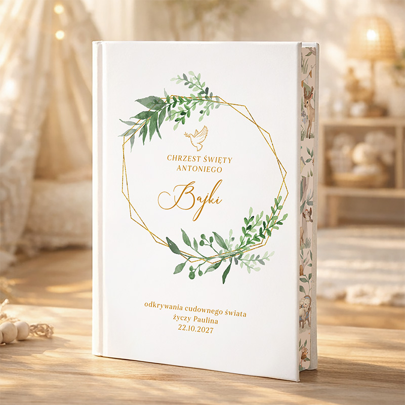 Personalizowana książka z bajkami to oryginalna pamiątka chrztu świętego, która łączy ponadczasową formę z codzienną funkcjonalnością. Wewnątrz znajduje się 40 różnorodnych opowieści napisanych z myślą o najmłodszych czytelnikach. Bajki są bogato ilustrowane i idealnie nadają się do wspólnego czytania z rodzicami. Z tego powodu książka nie tylko upamiętnia ważny dzień, ale też towarzyszy dziecku przez kolejne lata. Okładka prezentuje się wyjątkowo elegancko – delikatna grafika z zielenią i złotym akcentem w formie geometrycznego wieńca subtelnie podkreśla charakter uroczystości. Personalizacja obejmuje imię dziecka, datę oraz krótką wiadomość, co sprawia, że każda książka staje się jedyna w swoim rodzaju. Dzięki temu prezent nabiera osobistego znaczenia.