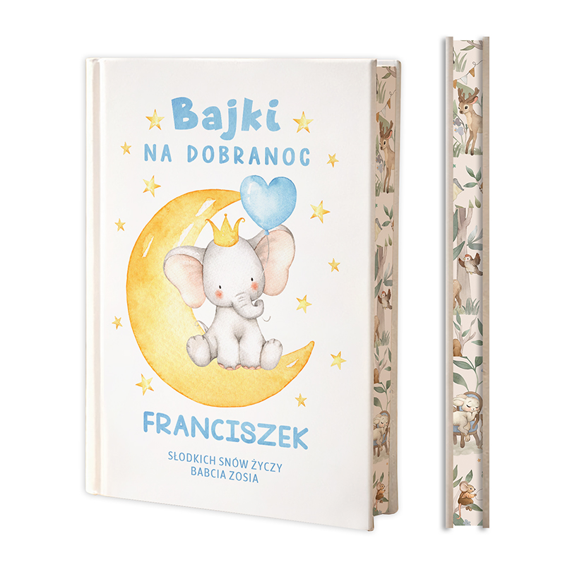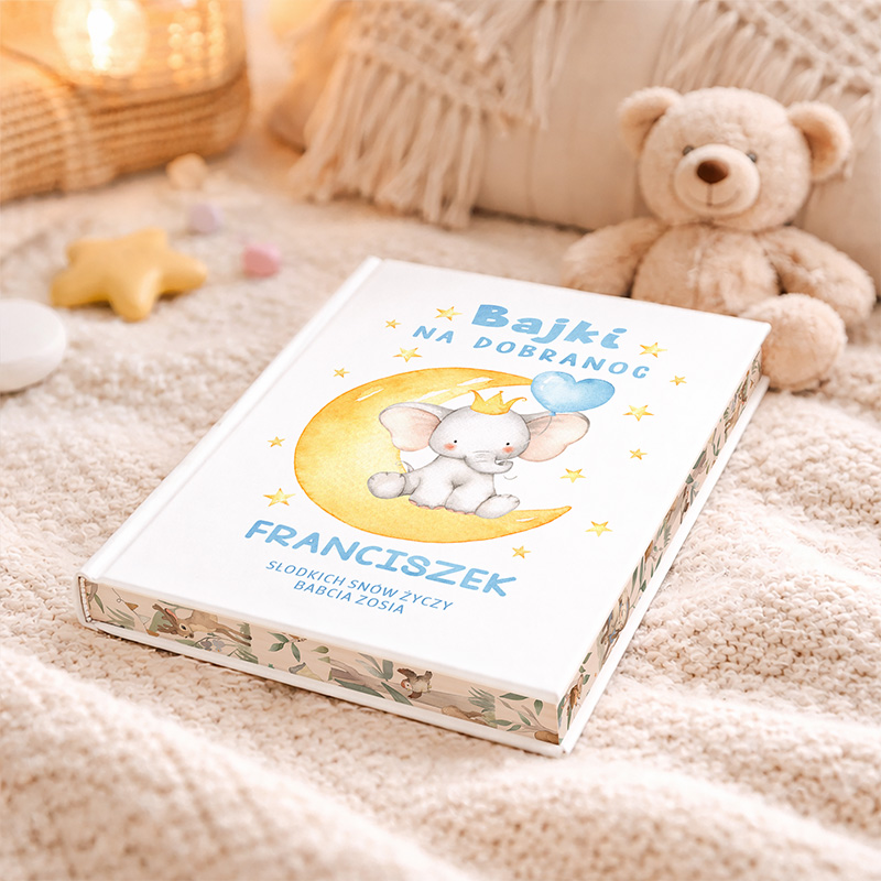 Prezent urodzinowy dla dziecka w formie książeczki z bajkami to fantastyczny pomysł. Okładka zdobiona dziecięcą grafiką uroczym słonikiem na księżycu oraz imieniem chłopca sprawia, że taki prezent na urodzinki jest jedyny w swoim rodzaju! Spraw swojemu dziecku mega niespodziankę.