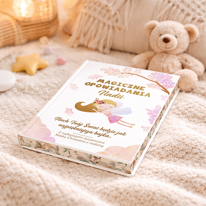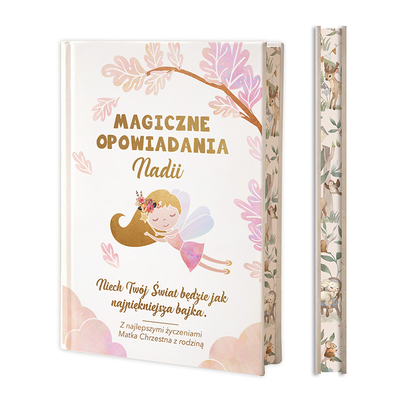 • na książce umieszczony jest napis „Magiczne opowiadania +i mię dziecka” oraz „Niech Twój świat będzie jak najpiękniejsza bajka” + informacja kto podarował ten wspaniały prezent,