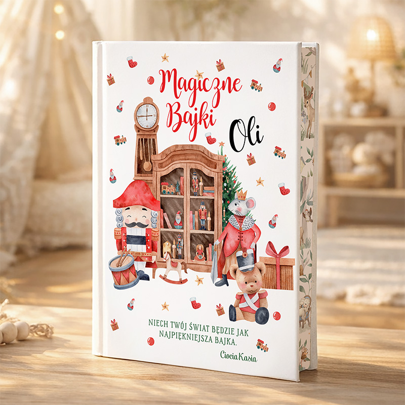 Personalizacja w postaci imienia dziecka w tytule książki Magiczne bajki IMIĘ DZIECKA oraz umieszczona niżej dedykacja, zwiększa ładunek emocjonalny prezentu i nadają mu osobisty charakter. Dzięki temu ta książka z bajkami staje się wspaniałą pamiątką. Uwagę już na wstępie zwraca bożonarodzeniowa grafika na okładce, od której bije sympatia i ciepło. Wprost ze świątecznie udekorowanego salonu spoglądają na nas wesołe postaci — dziadek do orzechów, myszka oraz miś, a wokół nich panuje prezentowy rozgardiasz. Wnętrze książki zawiera wiele ciekawych i zabawnych historii opatrzonych dużą ilością pięknych ilustracji. Szata graficzna jest rozbudowana i dopracowana w najmniejszych szczegółach, a treść pełna interesujących i wartościowych opowieści.