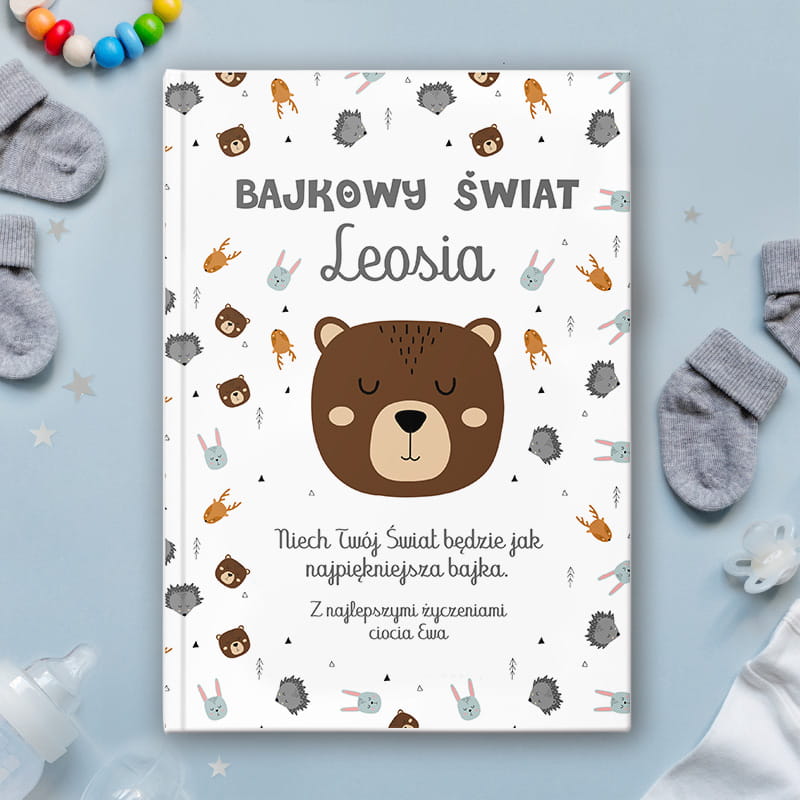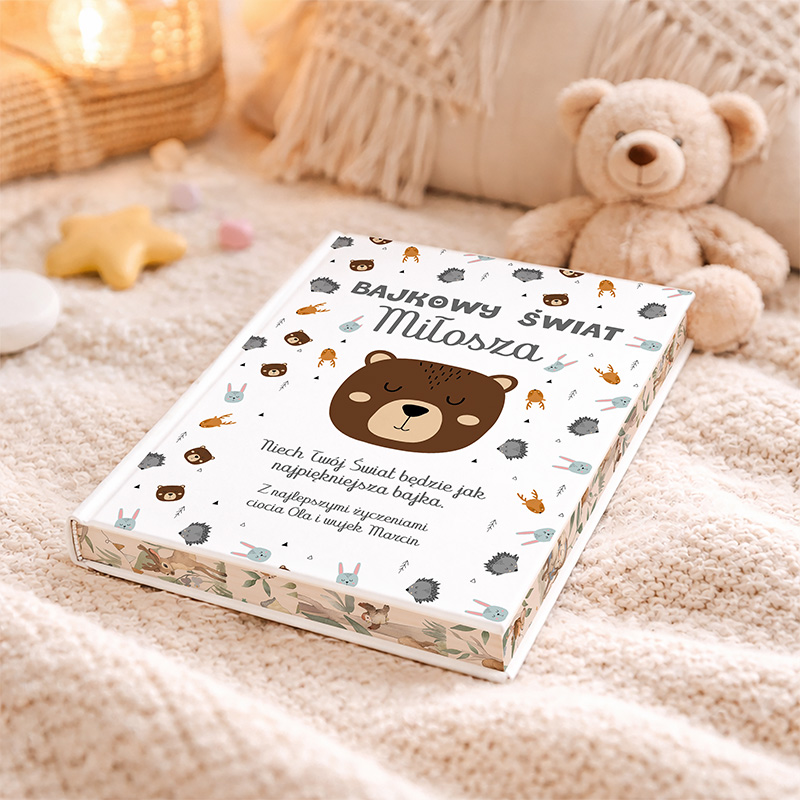 Okładkę książki dziecięcej zdobią grafiki inspirowane stylem nordyckim – niedźwiadki, leśne zwierzątka i delikatne motywy przyrody. Całość utrzymana jest w harmonijnych barwach, które nie przytłaczają, a jednocześnie przyciągają wzrok dziecka. Twarda oprawa sprawia, że książka jest trwała i dobrze znosi częste użytkowanie. Wewnątrz znajdują się bajki, które pomagają wyciszyć malucha przed snem i rozwijają wyobraźnię. Wyjątkowym detalem są kolorowe brzegi stron, które nadają książce efekt „wow” i sprawiają, że prezentuje się niezwykle bajkowo.