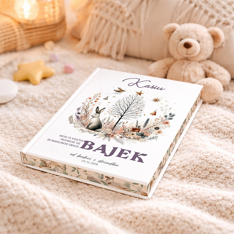 Ponadto piękna oprawa graficzna książki sprawia, że jest ona również estetycznym dodatkiem do dziecięcego pokoju. Dzięki temu księga bajek świetnie sprawdzi się jako prezent świąteczny, który zachwyci zarówno młodego odbiorcę, jak i jego opiekunów. Okładka książki zachwyca delikatnym, bajkowym klimatem. Na środku widnieje smukłe drzewo otoczone ilustracjami leśnych zwierząt, takich jak zając i wiewiórka. Wokół drzewa rozmieszczono detale w postaci gwiazdek, dzwoneczków i kwiatów. U góry znajduje się miejsce na imię dziecka. Pod obrazkiem natomiast widnieje pole na indywidualny podpis. Projekt jest harmonijny i idealnie oddaje magiczny nastrój książki.