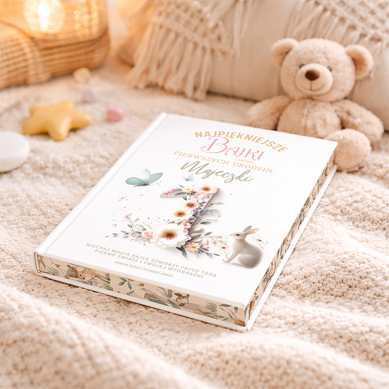 Książka z tytułem "Najpiękniejsze Bajki z okazji pierwszych urodzin Majeczki", zdobiona kwiatami i motylem.