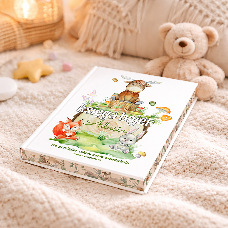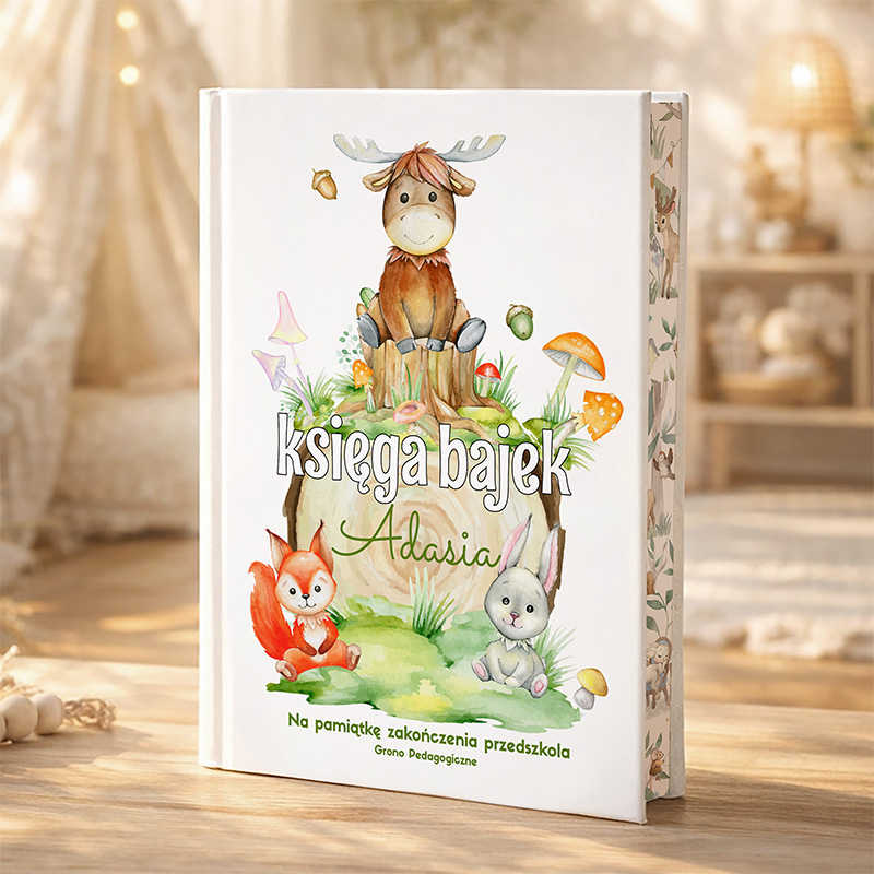 - Oprawa książki jest twarda i solidna, a jej część okładkowa zdobi piękna, dziecięca grafika z personalizowaną dedykacją. Na okładce oprócz kolorowego obrazka z uroczymi mieszkańcami lasu, honorowe miejsce zajmie imię dziecka, które będzie stanowić część tytułu książeczki. Napis KSIĘGA BAJEK + odmienione imię dziecka specjalnie pod zamówienie uzupełnimy o podpis od kogo jest prezent i na jaką okazję. Dedykację NA ZAKOŃCZENIE PRZEDSZKOLA zakończymy nazwą placówki i datą zakończenia edukacji w przedszkolu.