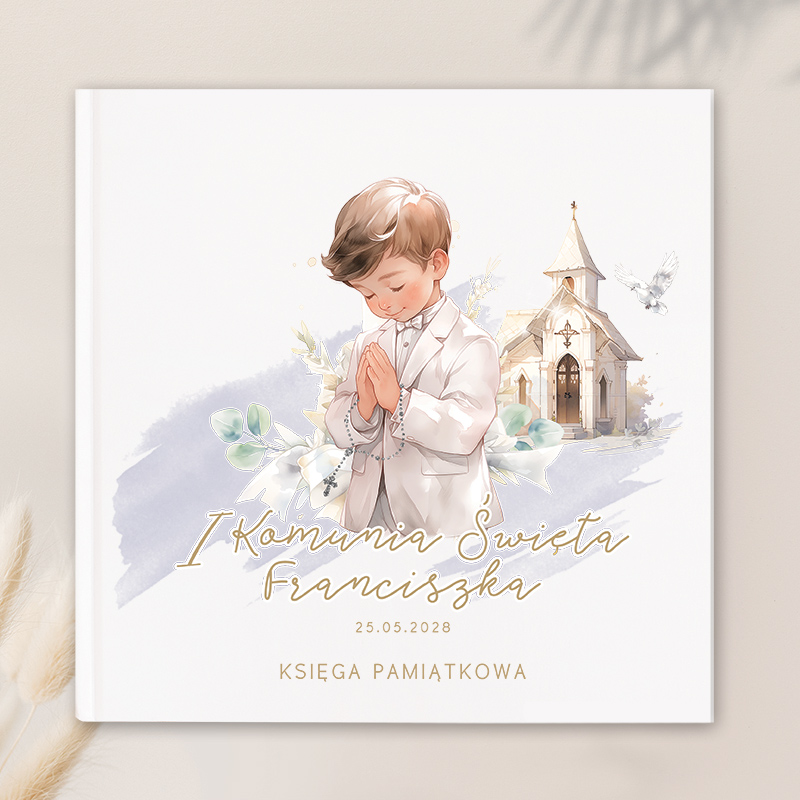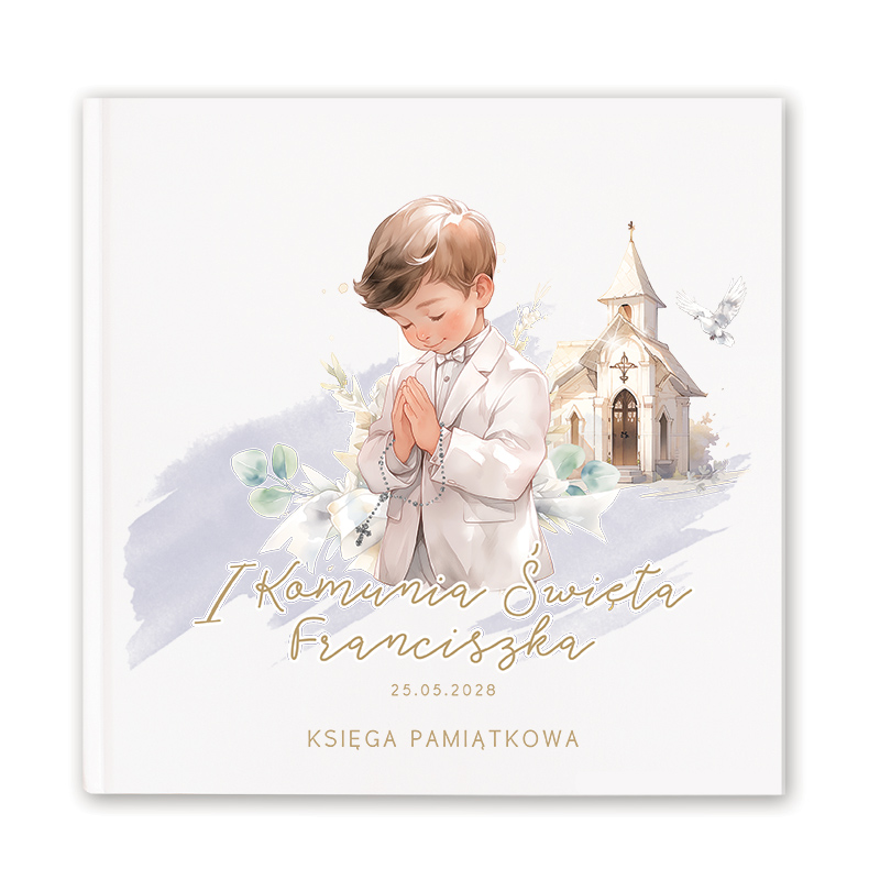 Księga gości na wpisy prezentuje się z elegancją i delikatnością, które odzwierciedlają istotę uroczystości Pierwszej Komunii. Okładka księgi zdobiona jest subtelną grafiką przedstawiającą chłopca w modlitwie. Chłopiec ubrany w jasny garnitur trzyma w rękach różaniec. Za nim widać kościół, który symbolizuje miejsce sakramentu. Nad kapliczką widnieje lecąca biała gołębica. Dodatkowym akcentem jest możliwość personalizacji – na okładce widnieje imię dziecka oraz data uroczystości, co czyni każdy egzemplarz wyjątkowym. Na samym dole znajduje się napis “Księga pamiątkowa”. Kolorystyka i motywy graficzne są dobrze przemyślane, tworząc spójny i estetyczny obraz. Księga zawiera aż 100 stron gotowych na wpisy i zdjęcia gości przybyłych na Komunię.