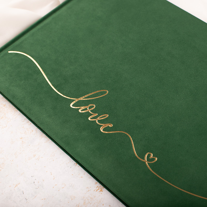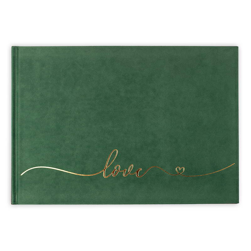 Księga ma zieloną, welurową oprawę z połyskującym napisem „love”. Gładki, miękki materiał doskonale prezentuje się w otoczeniu ślubnych dekoracji. Każda ze stron zawiera gotową ankietę z miejscem na zaznaczenia i krótkie odpowiedzi gości weselnych.