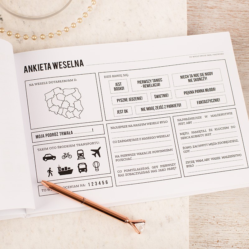 - Księga ma ankiety jednostronne – biała strona + ankieta (biała strona może posłużyć jako miejsce na zdjęcie, czy życzenia od gości).