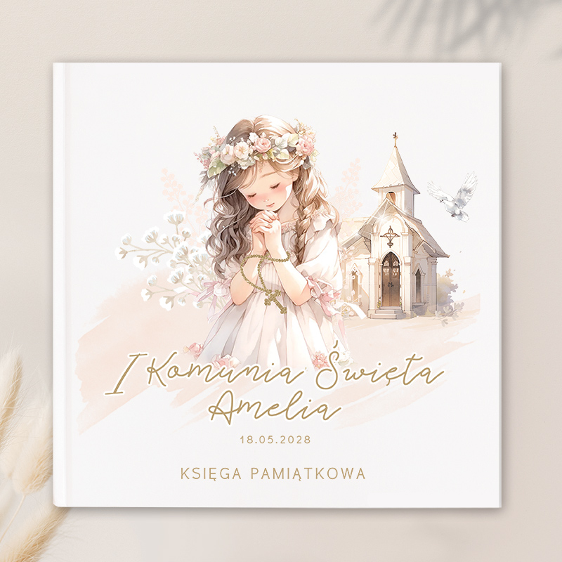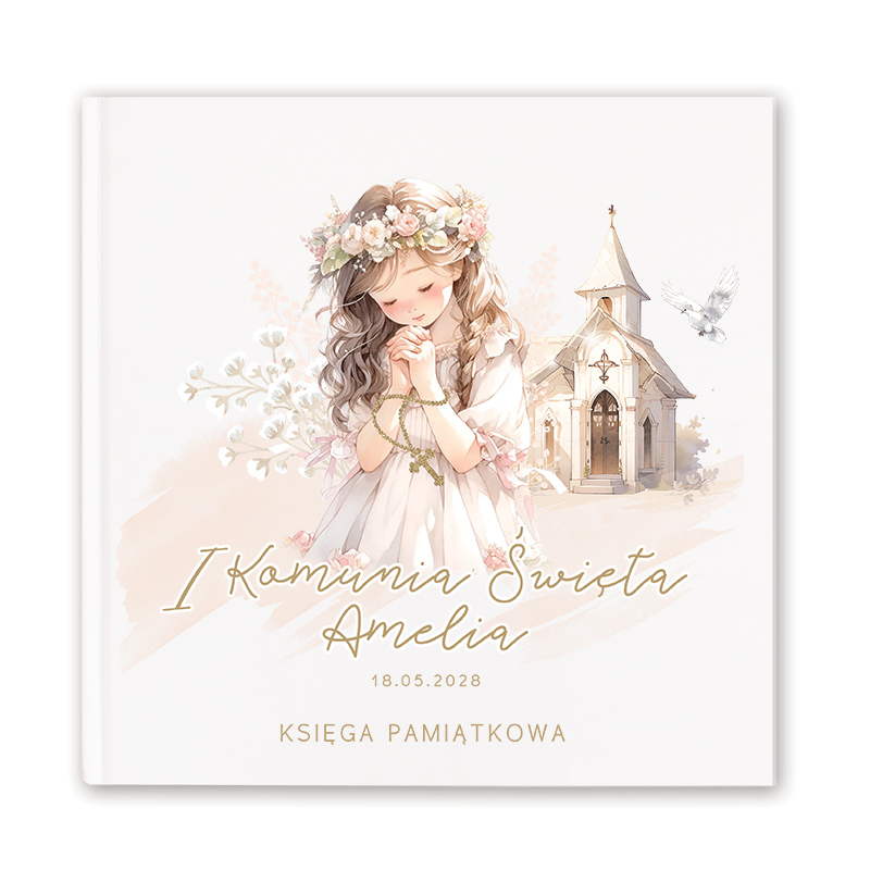 Księga pamiątkowa na wpisy charakteryzuje się przemyślanym designem, gdzie na okładce widnieje subtelna grafika przedstawiająca dziewczynkę w komunijnym stroju. Dziewczynka stoi w modlitewnej pozie, trzymając w dłoniach różaniec. Na jej głowie znajduje się piękny wianek złożonych z różowych i białych kwiatów. W tle widać subtelny rysunek kościoła oraz lecącą nad nim białą gołębicę. Całość utrzymana jest w pastelowej kolorystyce z dominującymi odcieniami białym i różowym, co dodaje elegancji i lekkości. Księga wykonana jest z wysokiej jakości materiałów, gwarantując trwałość i estetyczny wygląd przez lata. Na froncie umieszczony jest również personalizowany napis “I Komunia Święta” wraz z imieniem dziewczynki, co czyni ją wyjątkowo osobistym upominkiem. Niżej widnieje data uroczystości oraz tekst “Księga pamiątkowa”, wskazujący na przeznaczenie przedmiotu. W środku księgi znajdują się puste kartki, które czekają na życzenia gości.