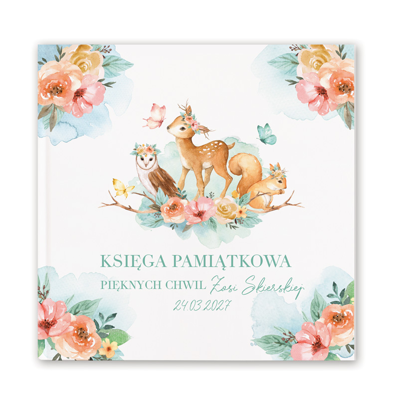 Księga pamiątkowa składa się z solidnej białej oprawy, wewnątrz której znajdują się białe kartki. Okładka księgi jest ozdobiona nadrukiem. Obrazek na okładce księgi przedstawia zwierzątka leśne w towarzystwie pięknych roślinnych zdobień. Jelonek sowa i wiewiórka tworzą centralną część grafiki, pod którą umieścimy Wasz spersonalizowany tytuł księgi. Na księdze umieścimy na Wasze specjalne zamówienie imię dziecka, napis urodzinki oraz datę.