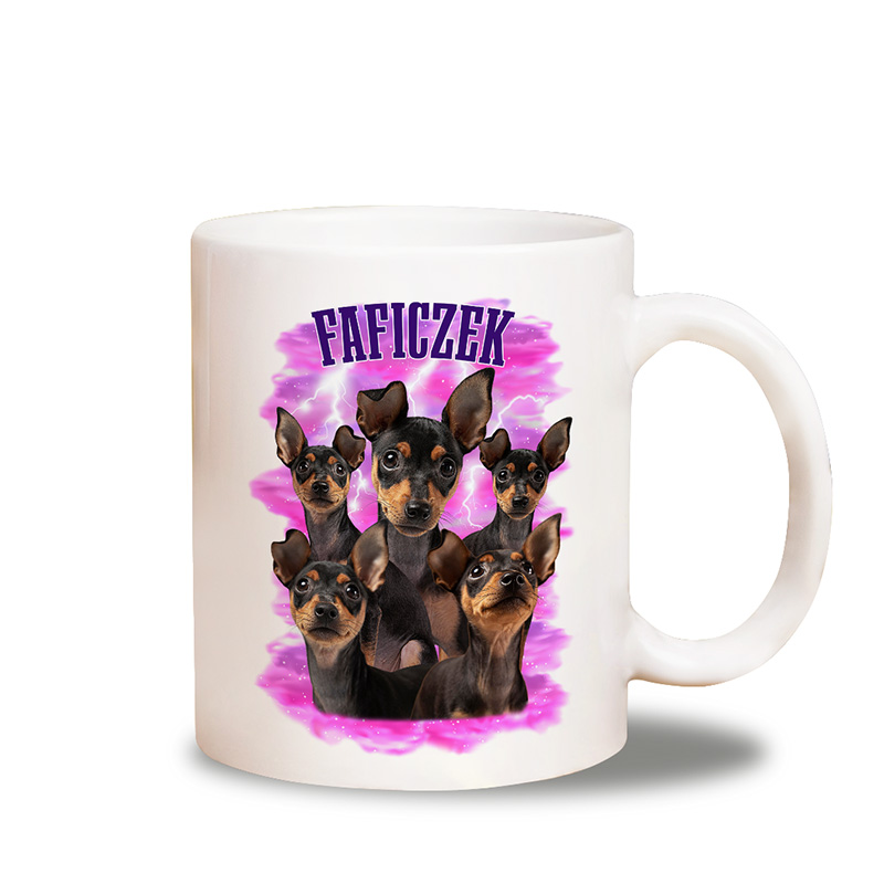Kubek ceramiczny inspirowany jest estetyką bootleg. To charakterystyczny, lekko przerysowany styl z popkulturowym zacięciem, który ostatnio szturmem podbija internet. Na tle kolorowej, energetycznej grafiki umieścimy zdjęcia Twojego zwierzaka, ułożone w efektowną kompozycję przypominającą plakat. Całość dopełnia imię pupila w wyrazistej czcionce.