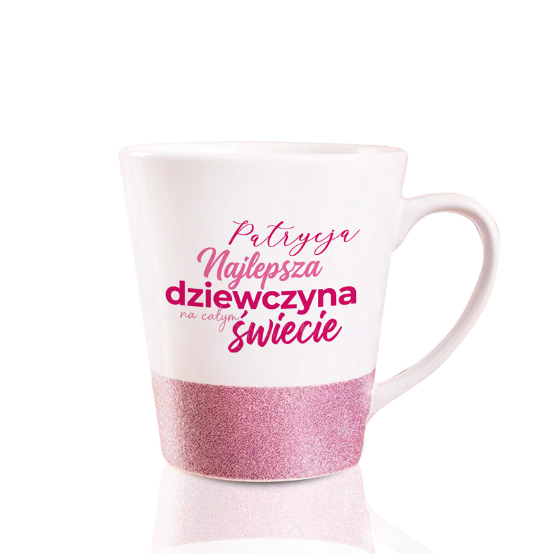 Kubek wykonany jest z wysokiej jakości ceramiki, a jego dolna część ozdobiona została efektownym, różowym brokatem, który pięknie odbija światło i przyciąga wzrok. Na kubku znajduje się napis: „Najlepsza dziewczyna na całym świecie”. Personalizacji podlega imię. Klasyczny kształt i wygodne ucho sprawiają, że kubek dobrze leży w dłoni i doskonale sprawdzi się do kawy, herbaty czy ulubionego napoju.