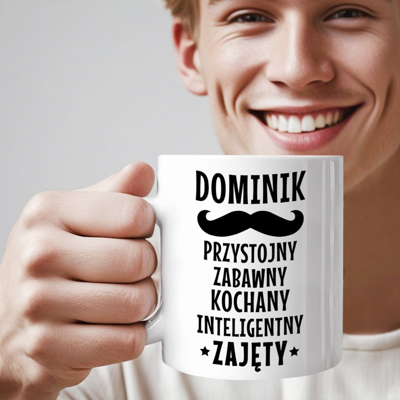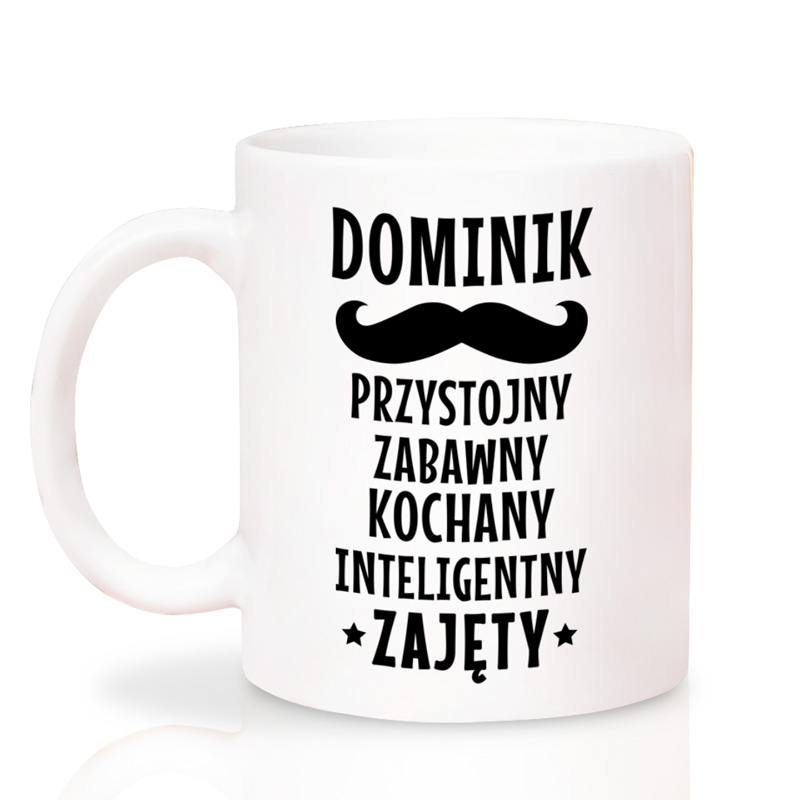 Biały kubek ceramiczny z dużym uchem. Na kubku znajduje się czarny nadruk, który ma definiować cechy idealnego mężczyzny, czyli Twojego faceta. Cechy, które mają odnosić się do właściciela kubka, wypisane są jedna pod drugą, ale listę poprzedzi imię i symbol czarnych wąsów: