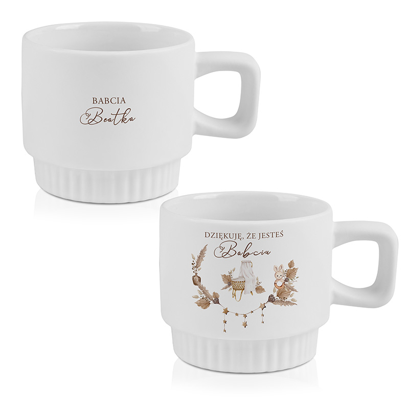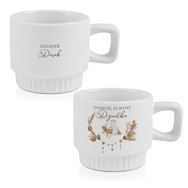 Kubek wykonany jest z wysokiej jakości ceramiki w klasycznym, białym kolorze. Dodatkowo jego dolna część posiada dekoracyjne ryflowaniem. Prosta forma w połączeniu z dekoracyjnym detalem sprawia, że filiżanka prezentuje się stylowo i ponadczasowo, pasując do każdego wnętrza. Na jednej stronie kubka znajduje się personalizowane imię Babci lub Dziadka. Druga strona zawiera wzruszający napis: „Dziękuję, że jesteś”, który w prostych słowach wyraża ogromną wdzięczność za obecność i wsparcie. Całość dopełnia subtelna grafika w stylu boho – delikatne roślinne motywy i dziecięca kołyska.