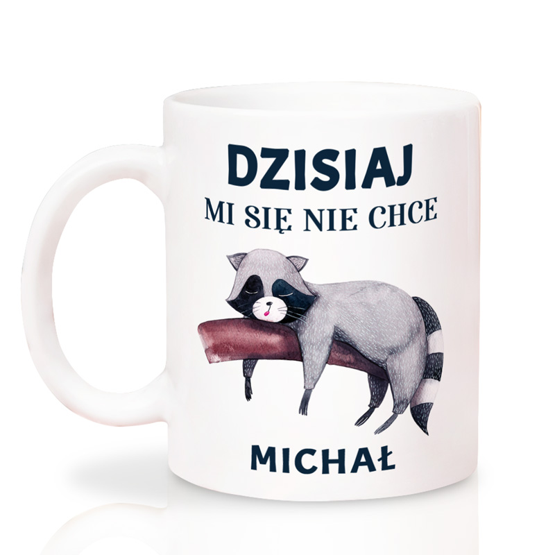 Personalizowany kubek leniucha posiada zabawny nadruk. Na jego powierzchni znajduje się grafika przedstawiająca szopa, który doskonale oddaje klimat lenistwa. Powyżej widnieje czarny i duży napis “DZISIAJ MI SIĘ NIE CHCE”. Personalizacji podlega imię, które umieścimy w dolnej części kubka.