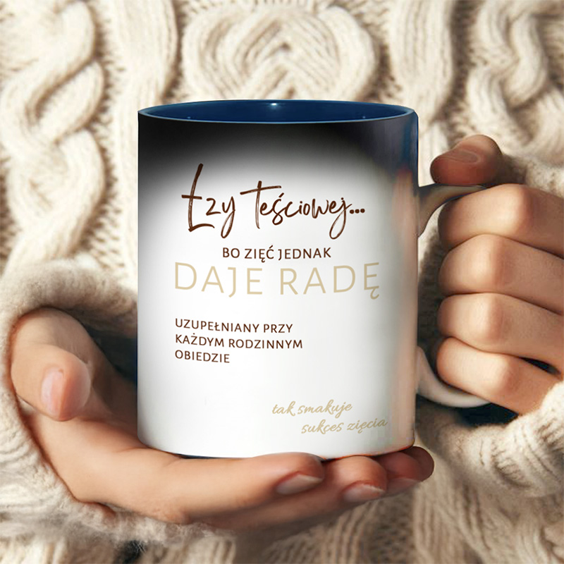Kubek z napisem na białym tle z ciemnoniebieskim wewnętrznym wykończeniem, trzymany przez osobę w beżowym swetrze. Tekst na kubku mówi o teściowej i zięciu, z dodatkowymi informacjami o obiadach rodzinnych.