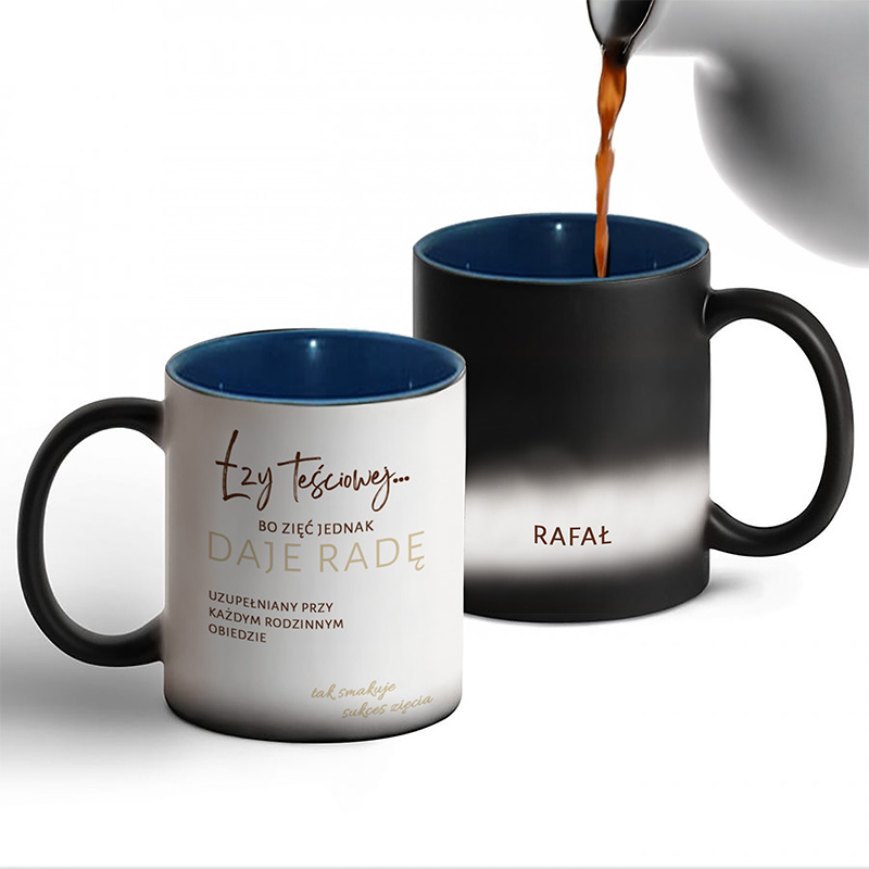 Na pierwszy rzut oka kubek wygląda elegancko i klasycznie – czarne wykończenie sprawia, że prezentuje się nowocześnie i stylowo. Jednak cała zabawa zaczyna się w momencie, gdy wlejesz do niego gorący napój. Dzięki efektowi termoaktywnemu kubek stopniowo zmienia wygląd, odsłaniając zabawny napis: „Łzy teściowej… bo zięć jednak daje radę. Uzupełniany przy każdym rodzinnym obiedzie – tak smakuje sukces zięcia”. To sprawia, że zwykła kawa czy herbata zamieniają się w mały rytuał pełen niespodzianki. Kubek dodatkowo jest personalizowany imieniem, co sprawia, że to upominek jedyny w swoim rodzaju.