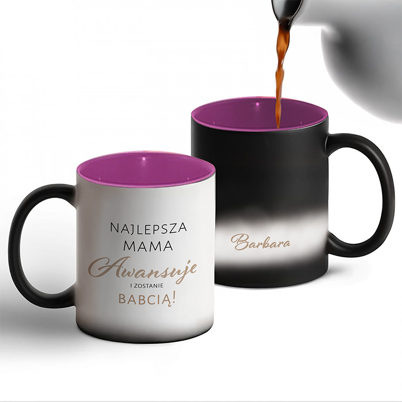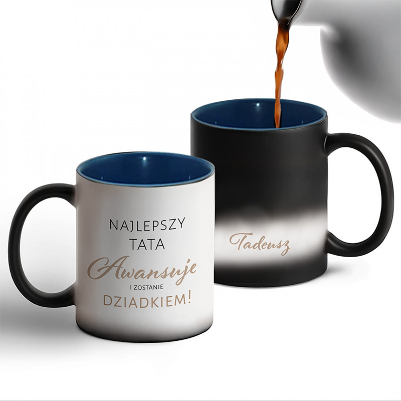 Magiczny kubek termoaktywny to niezwykły sposób na przekazanie najpiękniejszej wiadomości – informacji o ciąży i rychłym pojawieniu się wnuka. Z zewnątrz jest czarny, a jego wnętrze występuje w dwóch wariantach kolorystycznych: granatowym dla dziadka lub różowym dla babci. Dzięki specjalnej powłoce kubek zmienia wygląd pod wpływem ciepła – po zalaniu gorącym napojem stopniowo odsłania personalizowany napis: „Najlepszy Tata awansuje i zostanie Dziadkiem!” lub „Najlepsza Mama awansuje i zostanie Babcią!”. Efekt zaskoczenia gwarantowany.
