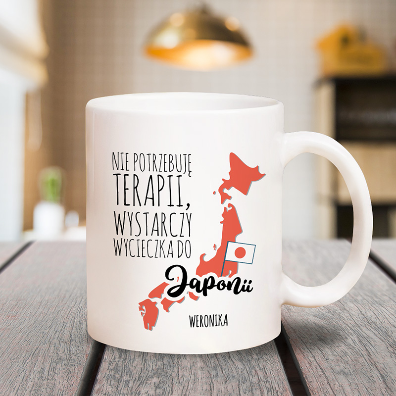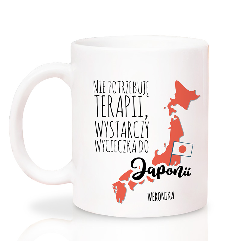 Kubek wykonany jest z wysokiej jakości ceramiki. Na froncie kubka znajduje się grafika z mapą Japonii w czerwonym kolorze, z umieszczoną flagą oraz zabawnym napisem „Nie potrzebuję terapii, wystarczy wycieczka do Japonii”. To idealne połączenie dla osób zakochanych w Japonii, które marzą o podróży do Tokio, Kioto czy podziwianiu kwitnących wiśni na własne oczy. Co więcej – kubek jest personalizowany imieniem osoby obdarowanej, co czyni go jeszcze bardziej wyjątkowym i osobistym prezentem.