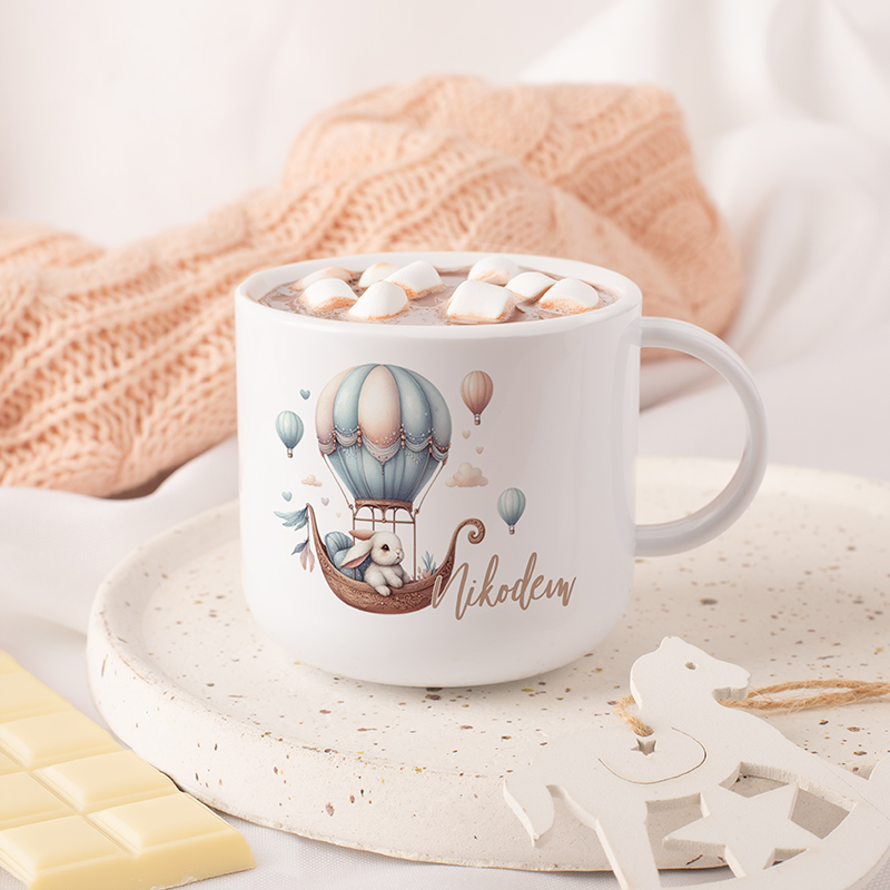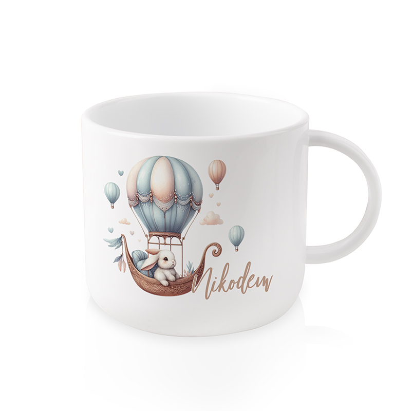 Kubek plastikowy z imieniem – Dziecięce Marzenia to praktyczne i estetyczne naczynie stworzone z myślą o najmłodszych. Na jego powierzchni znajduje się delikatna ilustracja króliczka siedzącego w koszu balonu unoszącego się nad chmurkami i otoczonego pastelowymi balonikami. Utrzymana w tonacjach błękitu, beżu i różu grafika sprawia, że kubek wpisuje się w bajkowy klimat całej kolekcji i z łatwością łączy się z innymi produktami z tej serii.