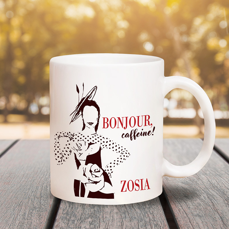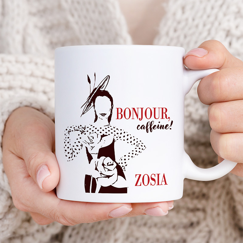 Kubek inspirowany Emily w Paryżu wykonany jest z ceramiki, dzięki czemu świetnie sprawdza się zarówno do porannej kawy, jak i popołudniowej herbaty. Jego biały kolor pięknie kontrastuje z czarno-czerwonym nadrukiem przedstawiającym modną sylwetkę kobiety oraz napis „Bonjour, caffeine!”. Całość dopełnia personalizowane imię, które nadaje kubkowi indywidualny charakter. Co więcej, nadruk utrzymany w minimalistycznym, paryskim stylu wygląda niezwykle elegancko, a sam kubek jest lekki i wygodny w użytkowaniu. Można go zabrać do pracy, postawić na biurku lub używać w domu podczas leniwych weekendowych poranków. Dzięki temu każdy łyk ulubionego napoju przypomina o pozytywnej energii i paryskim luzie. Kubek ma klasyczną pojemność około 330 ml, co sprawia, że mieści idealną porcję kawy lub herbaty. Uchwyt jest wygodny, a gładka powierzchnia przyjemna w dotyku. Nadruk jest trwały, więc można cieszyć się nim przez długi czas bez obaw o blaknięcie kolorów.