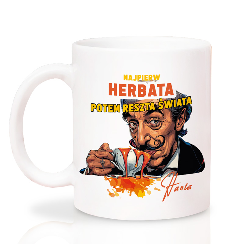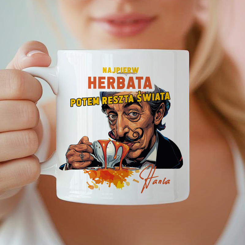 Kubek został wykonany z wysokiej jakości ceramiki. Na froncie kubka znajduje się ilustracja przedstawiająca postać inspirowaną słynnym malarzem Salvadorem Dalí. Mężczyzna trzyma w dłoni filiżankę, z której rozlewa się herbata. Grafika została wykończona przez napis: „Najpierw herbata, potem reszta świata”. Dodatkowo na kubku umieszczone imię obdarowanej osoby.