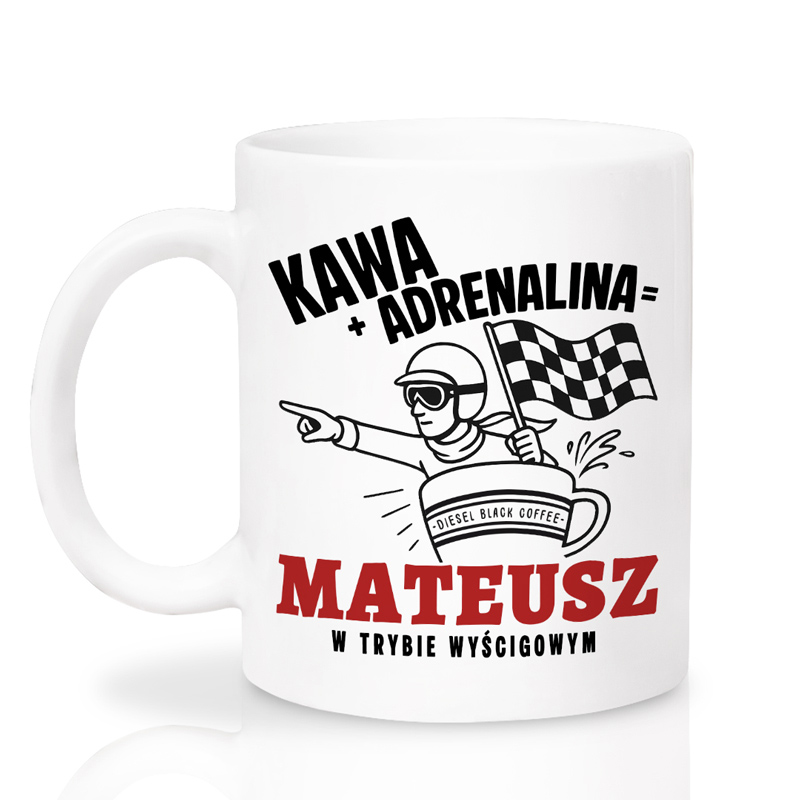 Kubek z hasłem „Kawa + Adrenalina = [imię] w trybie wyścigowym” to świetna propozycja dla każdego, kto kocha prędkość i poranne rytuały z kofeiną. Dynamiczna grafika, wyrazisty nadruk i personalizacja imieniem sprawiają, że to oryginalny prezent dla fana Formuły 1. Idealny do biura, garażu lub kuchni. Łączy funkcję praktyczną z wyścigowym stylem.