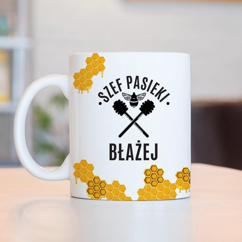 Kubek jest w białym kolorze, a jego powierzchnię zdobi oryginalna grafika z pszczelim motywem. Żółte plastry miodu ułożone w dolnej i górnej części kubka. Centralnym punktem jest napis “SZEF PASIEKI” w czarnej, wyrazistej czcionce o industrialnym charakterze, która świetnie kontrastuje z jasnym tłem. Poniżej umieścimy imię właściciela, które wykonamy drukowanymi literami, dzięki czemu całość prezentuje się nowocześnie i elegancko. Dwa skrzyżowane nabieraki do miodu oraz mała pszczółka pośrodku dopełniają cały projekt.