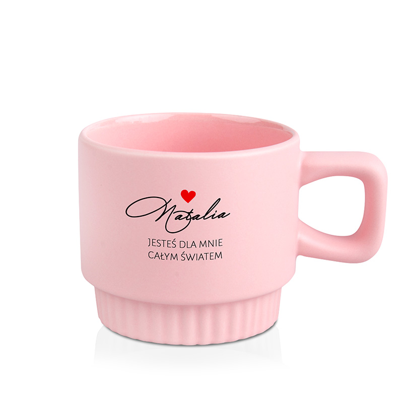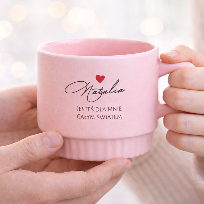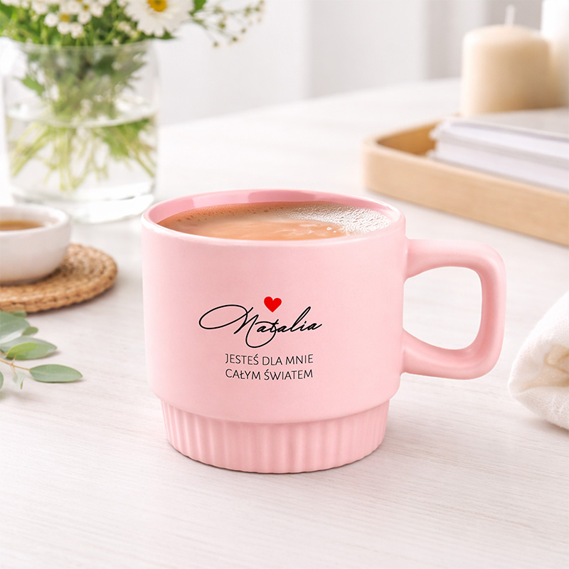Różowy kubek z ryflowanym dołem to prezent, który łączy funkcjonalność z ciepłym przekazem. Dzięki personalizacji imieniem, staje się unikalnym upominkiem. Kubek posiada matowe wykończenie i ryflowany spód. Na froncie znajduje się napis zawierający imię oraz napis „Jesteś dla mnie całym światem” i małe czerwone serduszko.