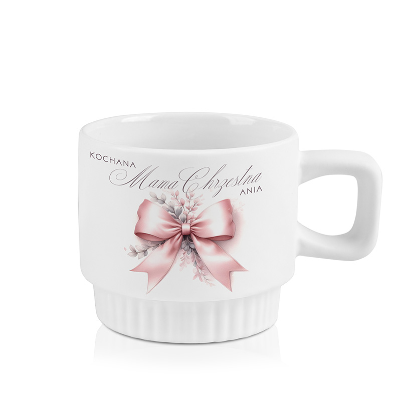 Kubek wykonany został z wysokiej jakości ceramiki w białym kolorze. Posiada charakterystyczny ryflowany dół, który dodaje mu nowoczesnego wyglądu. Na froncie znajduje się napis: „Kochana Mama Chrzestna” oraz imię. Personalizacja sprawia, że kubek staje się naprawdę osobisty. Na kubku znalazła się także ciekawa grafika przedstawiająca różową kokardę.  Całość utrzymana jest w pastelowych barwach.