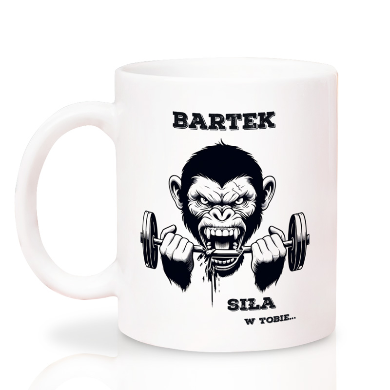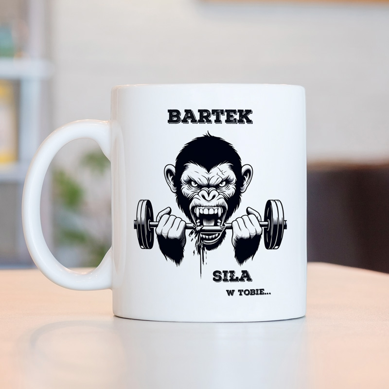 Ceramiczny biały kubek ozdobiony jest wyrazistą grafiką przedstawiającą groźnego goryla ściskającego sztangę. Symbolizuje siłę, determinację i charakter. Nad grafiką znajduje się personalizowane imię, a pod spodem motywujący napis “Siła w Tobie…”. To właśnie personalizacja sprawia, że kubek staje się wyjątkowym, indywidualnym prezentem dla każdego miłośnika treningów.