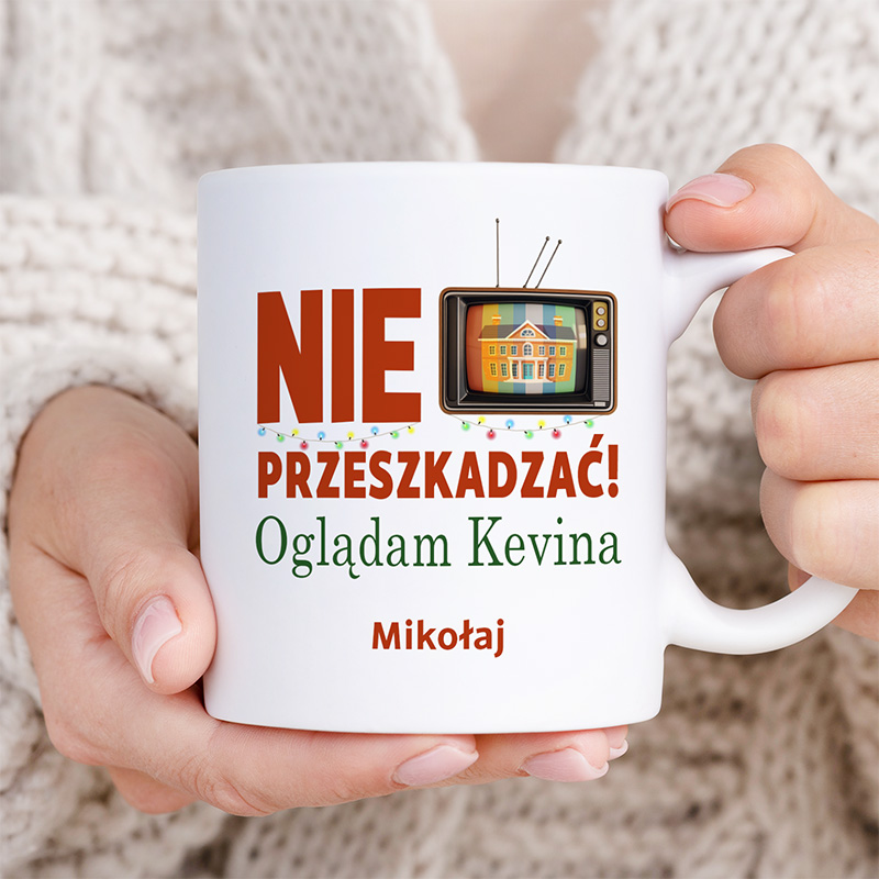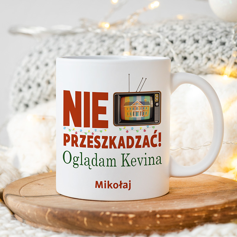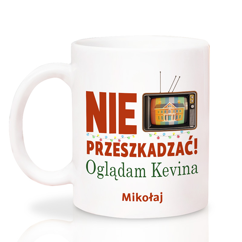 Biały kolor kubka stanowi idealne tło dla kolorowego nadruku z telewizorem i świątecznymi lampkami. Na środku widnieje duży, czytelny napis „Nie przeszkadzać! Oglądam Kevina”. Możliwość dodania imienia na dole kubka sprawia, że produkt nabiera osobistego charakteru. Ceramika dobrej jakości zapewnia trwałość i komfort użytkowania. Dzięki dobrze wyprofilowanemu uchwytowi kubek doskonale leży w dłoni, a jego odpowiednia pojemność pozwala na długie chwile relaksu przy ulubionym napoju.