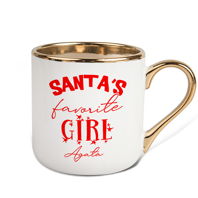 Kubek świąteczny powstał z wysokiej jakości ceramiki. Posiada złoty rant i uchwyt. Nadruk „Santa’s Favorite Girl” w czerwonym kolorze kontrastuje z jasnym tłem. Poniżej jest miejsce na personalizowane imię. Wygodny uchwyt i odpowiednia pojemność sprawiają, że picie kawy, herbaty czy gorącej czekolady staje się prawdziwą przyjemnością.