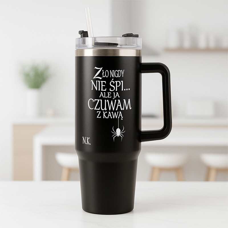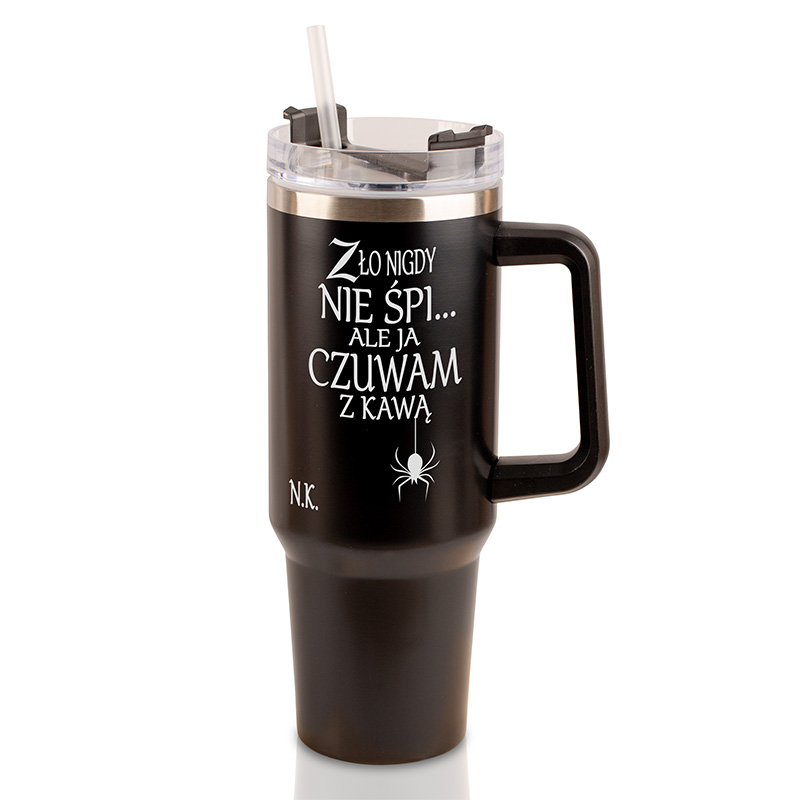 - Kubek termiczny posiada słomkę i ergonomiczny uchwyt.