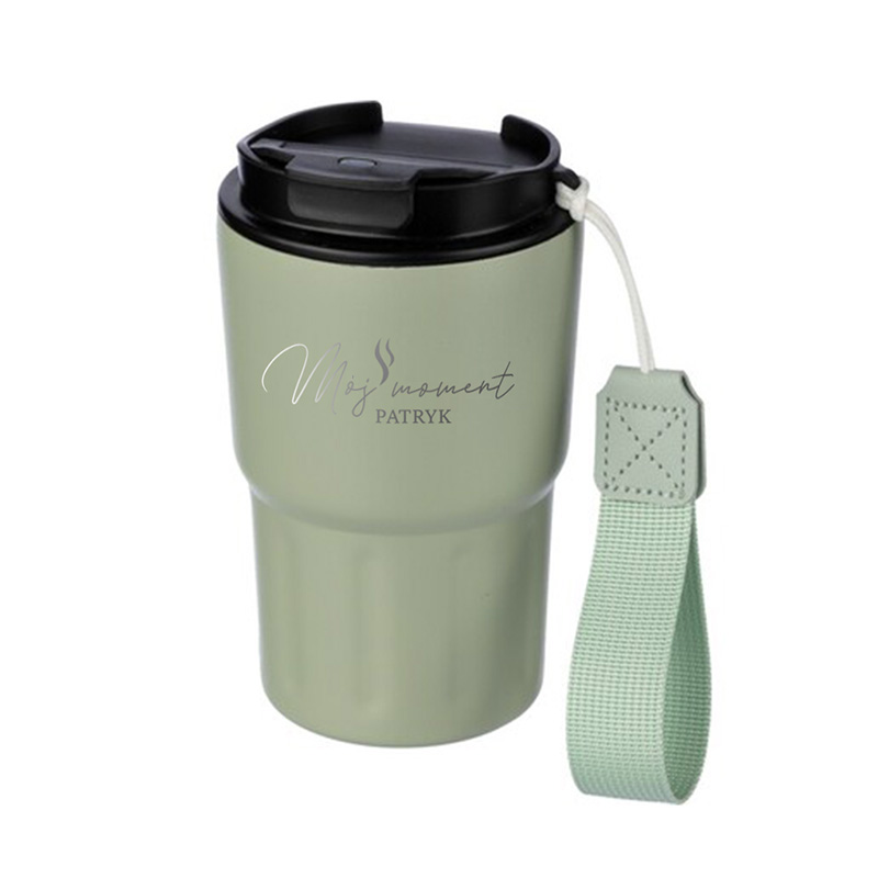 Personalizowany termo kubek wykonany jest z podwójnych ścianek ze stali nierdzewnej z próżnią między nimi, kubek zapewnia skuteczną izolację termiczną. Utrzymuje temperaturę gorących napojów nawet do 10 godzin, dzięki czemu kawa czy herbata pozostają ciepłe przez długi czas. Szczelna pokrywka ogranicza ryzyko rozlania, a materiałowy pasek ułatwia przenoszenie i daje dodatkową wygodę w drodze. Stonowany, naturalny odcień szałwii nadaje kubkowi uniwersalnego charakteru, pasującego zarówno do kobiet, jak i mężczyzn. Minimalistyczny design sprawia, że to świetny wybór dla osób ceniących prostotę i praktyczne rozwiązania. Dekoracyjną czcionką wykonamy napis: “Mój moment”. Personalizacji podlega imię.