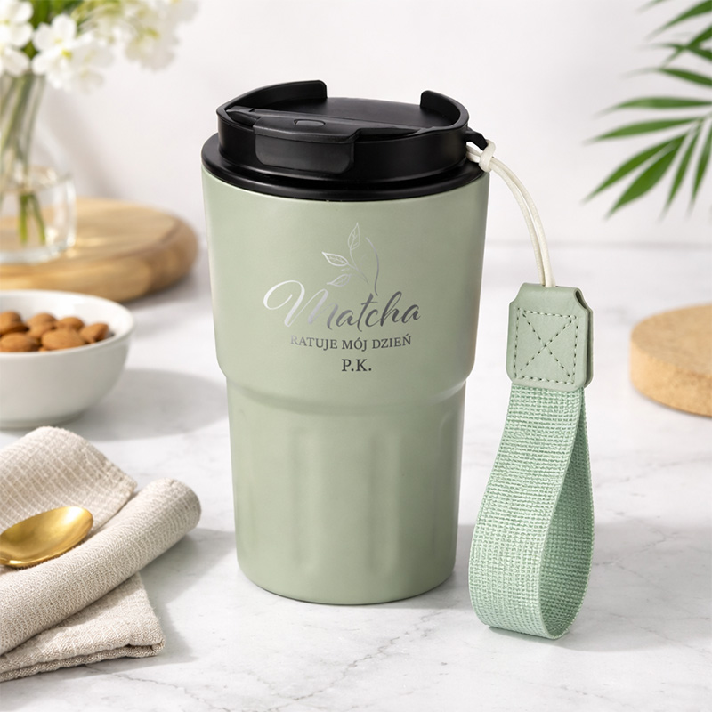 Termo kubek wykonany jest z podwójnych ścianek ze stali nierdzewnej, pomiędzy którymi znajduje się próżnia, co zapewnia skuteczną izolację termiczną. Dzięki temu utrzymuje temperaturę gorących napojów nawet do 10 godzin. Szczelna pokrywka ogranicza ryzyko rozlania, a materiałowy pasek ułatwia przenoszenie kubka w dłoni. Kubek jest w modnym szałwiowym kolorze. Na nim umieścimy napis: “Matcha ratuje mój dzień”. Personalizacji podlegają inicjały.
