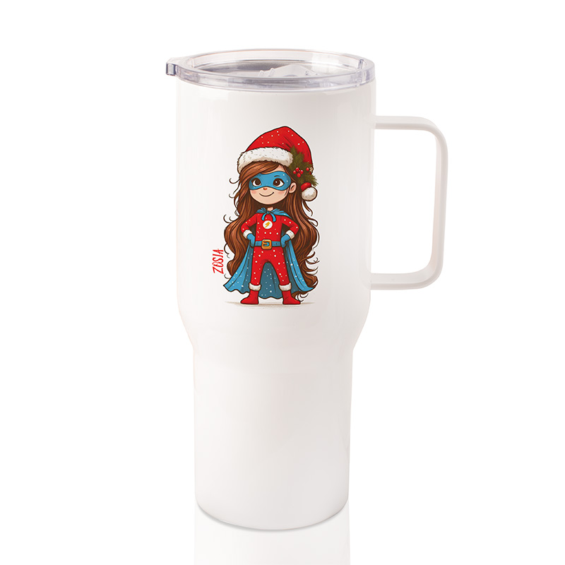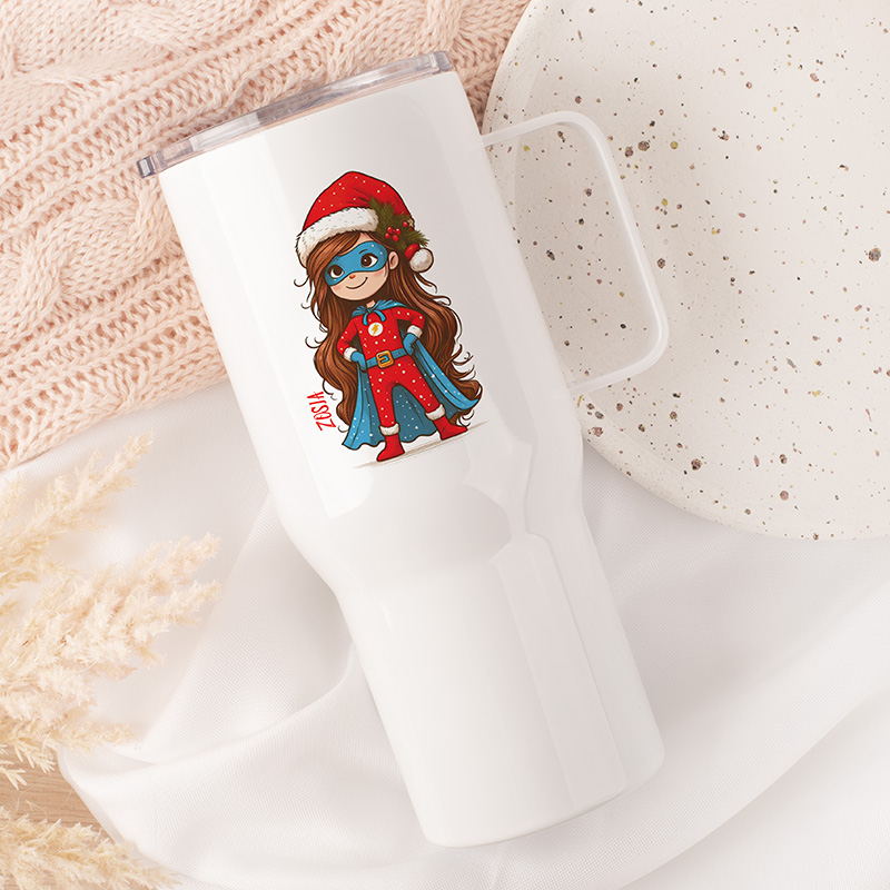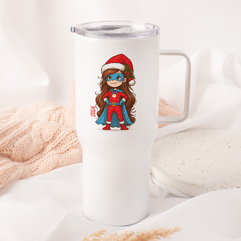Kubek termiczny z imieniem i motywem świątecznym to praktyczny dodatek dla dziecka, które lubi mieć ulubiony napój zawsze pod ręką. Na białej powierzchni znajduje się kolorowa ilustracja dziewczynki w stroju superbohaterki – z peleryną, maską i czerwonym strojem w świąteczne wzory – uzupełniona czapką Mikołaja, co nadaje całości radosnego charakteru. Dzięki temu kubek wyróżnia się wśród codziennych akcesoriów, a personalizacja imieniem sprawia, że łatwo rozpoznać właściciela i nadaje mu indywidualny charakter.