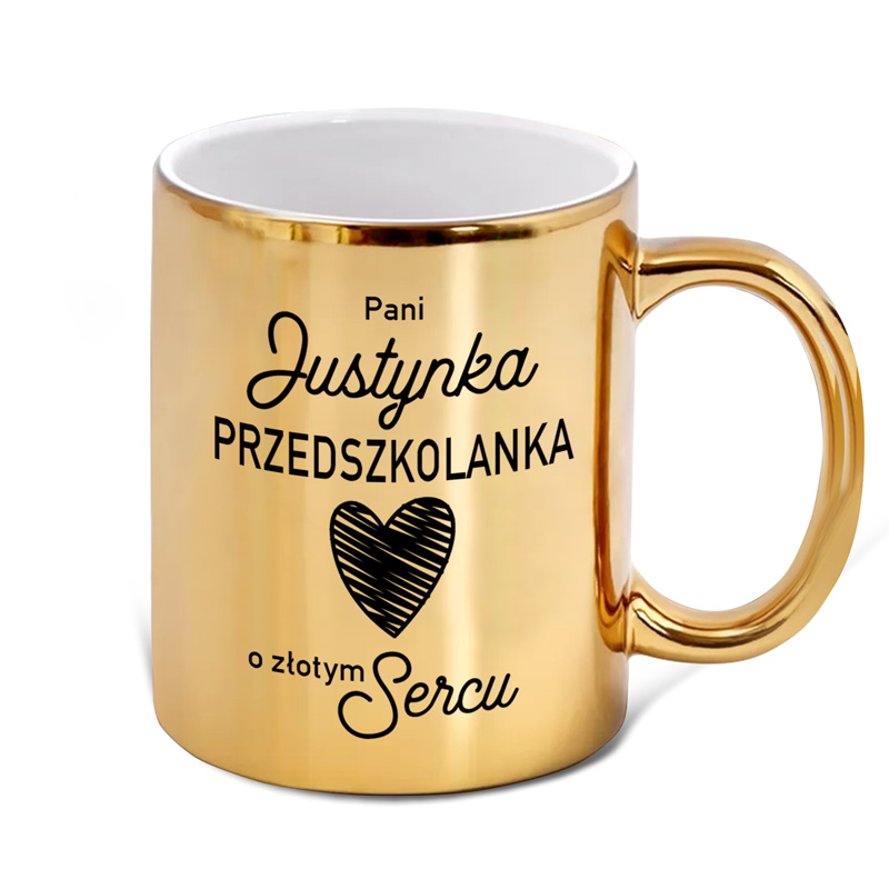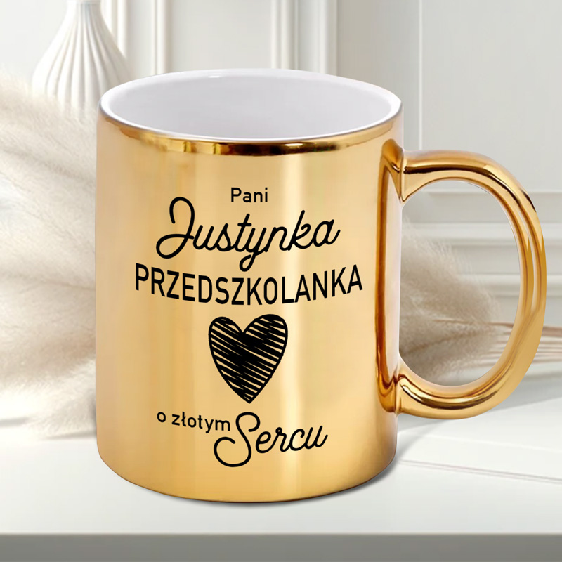 Kubek w złotym kolorze z napisem „Pani [Imię] Przedszkolanka o złotym Sercu” to upominek, który łączy funkcjonalność z wyjątkowym, eleganckim designem. Błyszczące, złote wykończenie sprawia, że wyróżnia się na tle zwykłych kubków.
