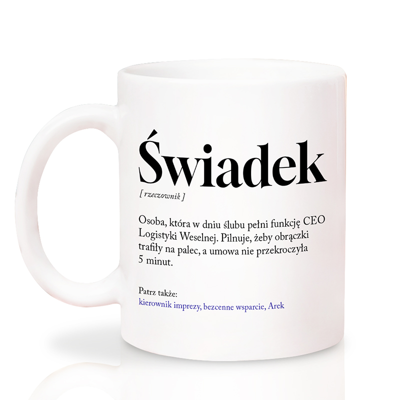 Personalizowany kubek „Świadek” lub „Świadkowa” z imieniem i zabawnym napisem to idealny prezent ślubny. Wykonany z białej ceramiki, z nadrukiem w formie definicji, będzie świetnym podziękowaniem za wsparcie, emocje i wspólne chwile pełne śmiechu.