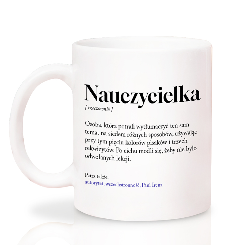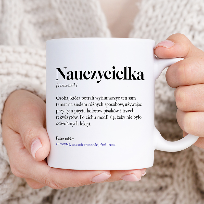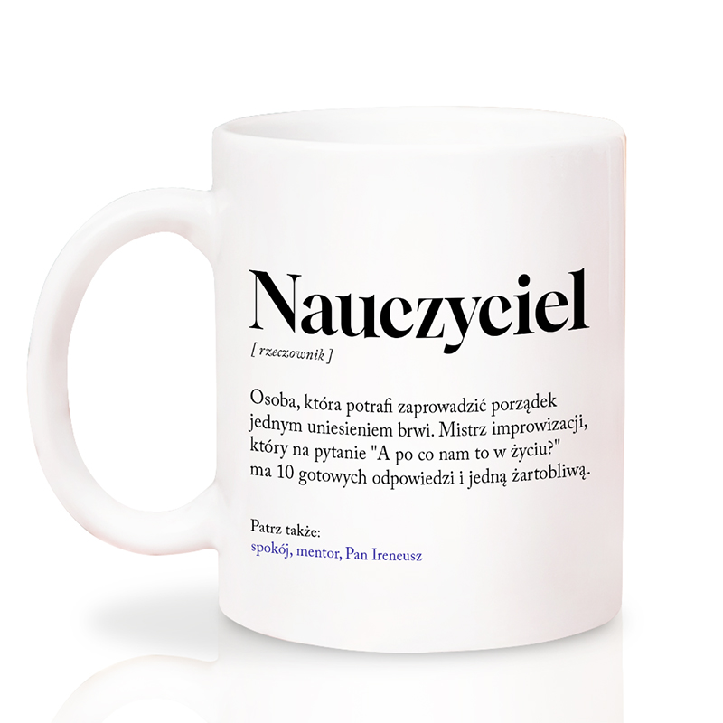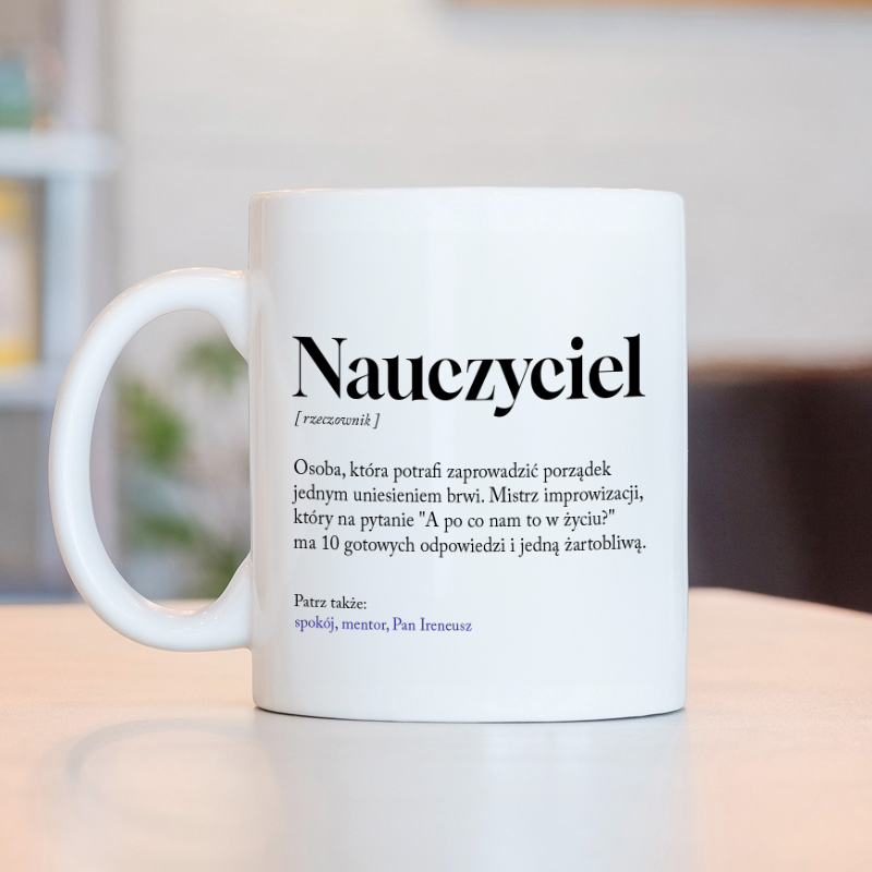 Personalizowany kubek z definicją słownikową to idealny prezent dla nauczycielki lub nauczyciela z okazji Dnia Nauczyciela, zakończenia roku szkolnego, czy po prostu jako miły gest wdzięczności. Każdy nauczyciel zaczyna dzień od kawy lub herbaty, a kubek z zabawnym napisem sprawi, że poranki w pokoju nauczycielskim, czy podczas lekcji będą przyjemniejsze.
