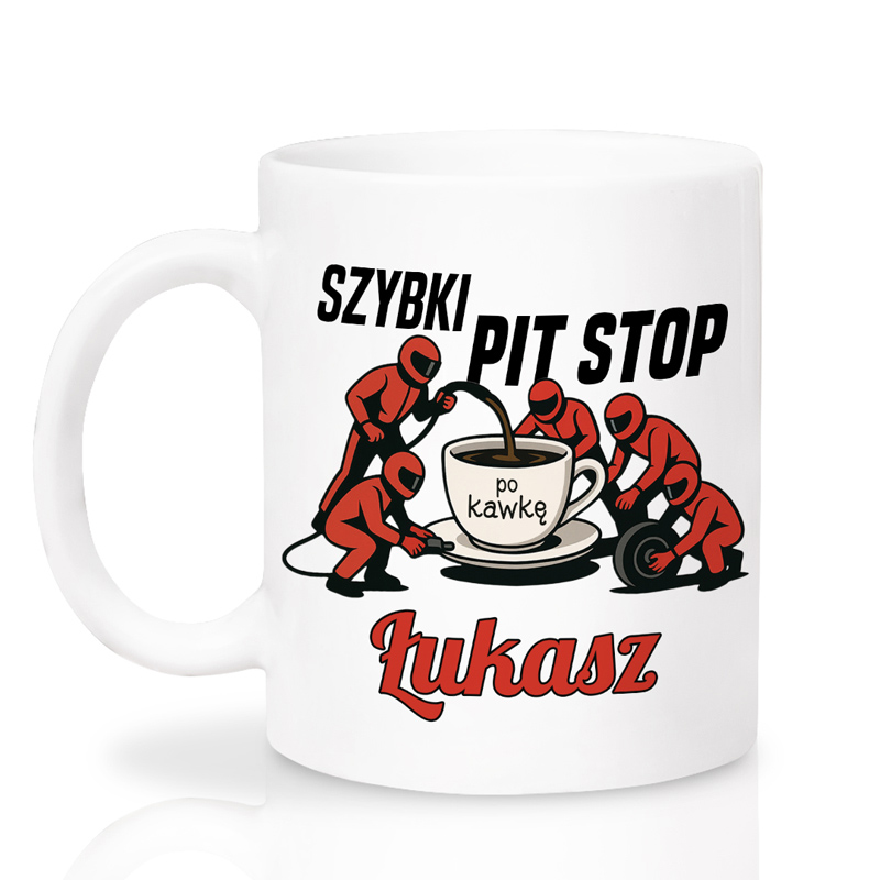 Personalizowany kubek dla fana Formuły 1 to idealny dodatek na biurko lub do kuchni. Nadruk z zespołem pit stop i tekstem „Szybki pit stop po kawkę” przyciąga uwagę. Dodanie imienia nadaje mu wyjątkowego charakteru. Dzięki temu to nie tylko zwykły kubek, ale również praktyczny prezent dla fana wyścigów F1, który można dopasować do odbiorcy. To doskonała opcja, gdy szukasz czegoś oryginalnego, a przy tym użytecznego. Ponadto kubek wprowadza odrobinę humoru do codziennej przerwy na kawę.