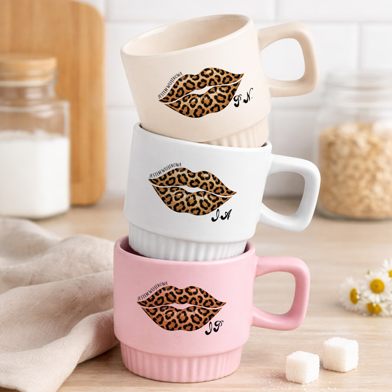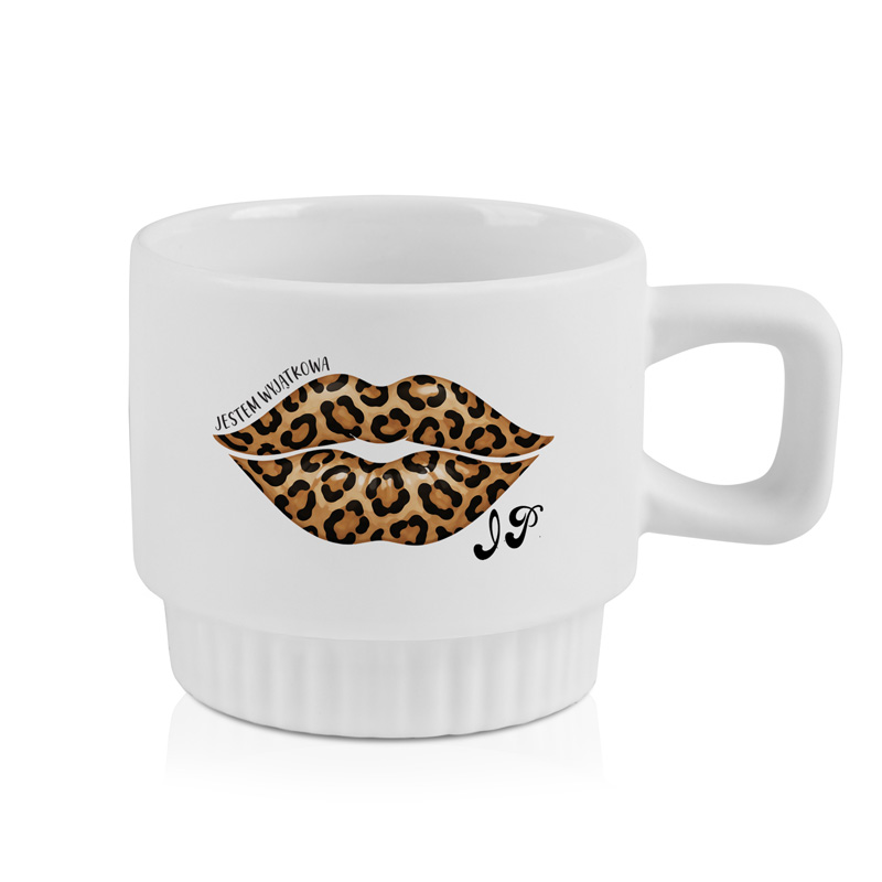 Kubek wykonany jest z wysokiej jakości ceramiki. Dolna część posiada charakterystyczne ryflowanie, które nadaje filiżance nowoczesnego wyglądu. Wyróżniającym elementem jest grafika kobiecych ust w modnym wzorze panterki. Nad grafiką widnieje napis „Jestem wyjątkowa”. Całość dopełniają personalizowane inicjały umieszczone obok grafiki. Dzięki temu kubek staje się unikalny i dopasowany do konkretnej osoby.